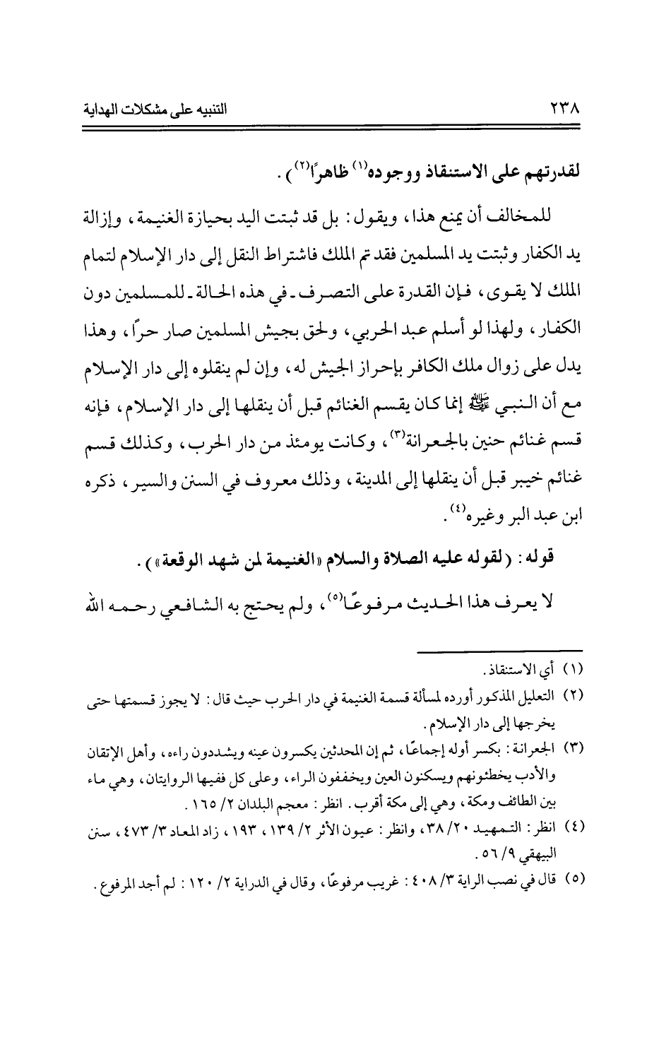 للمخالف أن يمنع هذا، ويقول: بل قد ثبتت اليد بحيازة الغنيمة، وإزالة يد الكفار وثبتت يد المسلمين فقد تم الملك فاشتراط النقل إلى دار الإسلام لتمام الملك لا يقوى، فإن القدرة على التصرف -في هذه الحالة -للمسلمين دون الكفار، ولهذت لو أسلم عبد الحربي، ولحق بجيش المسلمين صار حرًا، وهذا يدل على زوال ملك الكافر بإحراز الجيش له، وإن لم ينقلوه إلى دار الإسلام مع أن النبي -صلى الله عليه وسلم- إنما كان يقسم الغنائم قبل أن ينقلها إلى دار الإسلام، فإنه قسم غنائم حنين بالجعرانة، وكانت يومئذ من دار الحرب، وكذلك قسم غنائم خيبر قبل أن ينقلها إلى المدينة، وذلك معروف في السنن والسير، ذكره ابن عبد البر وغيره.