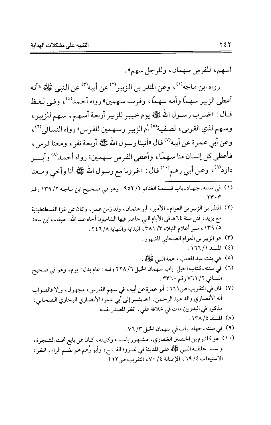 رواه ابن ماجه، وعن المنذر بن الزبير عن أبيه عن النبي -صلى الله عليه وسلم- "أنه أعطى الزبير سهمًا وأمه سهمًا، وفرسه سهمين" رواه أحمد، وفي لفظ قال: "ضرب رسول الله -صلى الله عليه وسلم- يوم خيبر للزبير أربعة أسهم، سهم للزبير، وسهم لذي القربى، لصفية أم الزبير وسهمين للفرس" رواه النسائي، وعن أبي عمرة عن أبيه قال "أتينا رسول الله -صلى الله عليه وسلم- أربعة نفر، ومعنا فرس، فأعطى كل إنسان منا سهمًا، وأعطى الفرس سهمين" رواه أحمد وأبو داود، وعن أبي رهم قال: "غزونا مع رسول الله -صلى الله عليه وسلم- أنا وأخي ومعنا