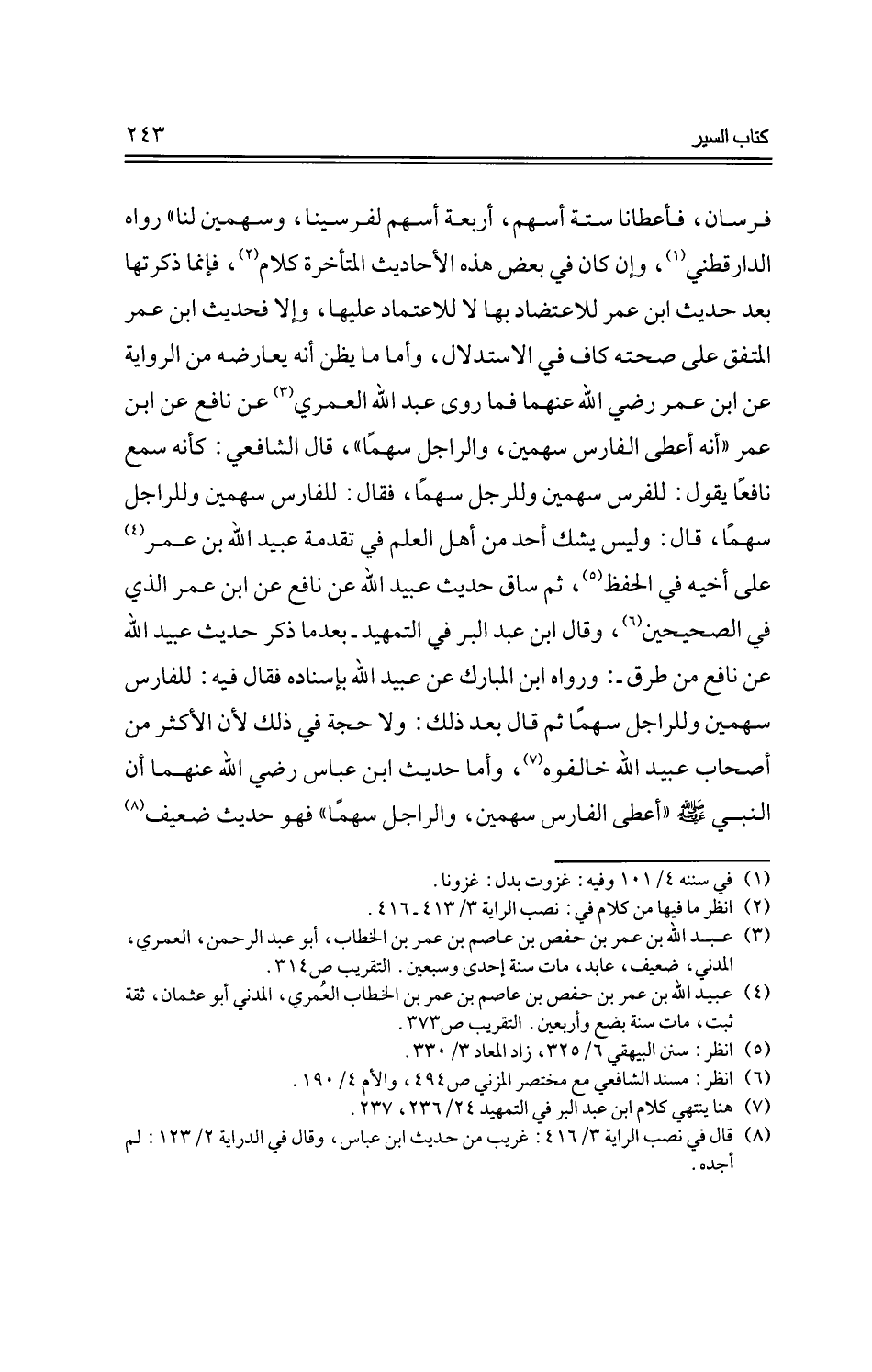 فرسان، فأعطانا ستة أسهم، أربعة أسهم لفرسينا، وسهمين لنا" رواه الدارقطني، وإن كان في بعض هذه الأحاديث المتأخرة كلام، فإنما ذكرتها بعد حديث ابن عمر للاعتضاد بها لا للاعتماد عليها، وإلا فحديث ابن عمر المتفق على صحته كاف في الاستدلال، وأما ما يظن أنه يعارضه من الرواية عن ابن عمر -رضي الله عنهما- فما روى عبد الله العمري عن نافع عن ابن عمر "أنه أعطى الفارس سهمين، والراجل سهمًا"، قال الشافعي: كأنه سمع نافعًا يقول: للفرس سهمين وللرجل سهمًا، فقال: للفارس سهمين وللراجل سهمًا، قال: وليس يشك أحد من أهل العلم في تقدمة عبيد الله بن عمر على أخيه في الحفظ، ثم ساق حديث عبيد الله عن نافع عن ابن عمر الذي في الصحيحين، وقال ابن عبد البر في التمهيد -بعدما ذكر حديث عبيد الله عن نافع من طرق-: ورواه ابن المبارك عن عبيد الله بإسناده فقال فيه: للفارس سهمين وللراجل سهمًا ثم قال بعد ذلك: ولا حجة في ذلك لأن الأكثر من أصحاب عبيد الله خالفوه، وأما حديث ابن عباس -رضي الله عنهما- أن النبي -صلى الله عليه وسلم- "أعطى الفارس سهمين، والراجل سهمًا" فهو حديث ضعيف