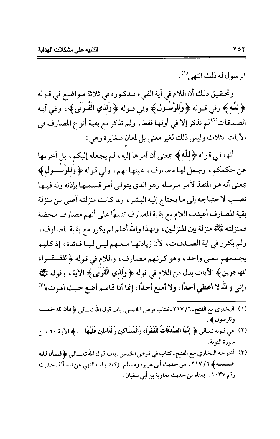 وتحقيق ذلك أن اللام في آية الفيء مذكورة في ثلاثة مواضع في قوله {لله} وفي قوله {وللرسول} وفي قوله {ولذي القربى}، وفي آية الصدقات لم تذكر إلا في أولها فقط، ولم تذكر مع بقية أنواع المصارف في الآيات الثلاث وليس ذلك لغير معنى بل لمعانٍ متغايرة وهي: