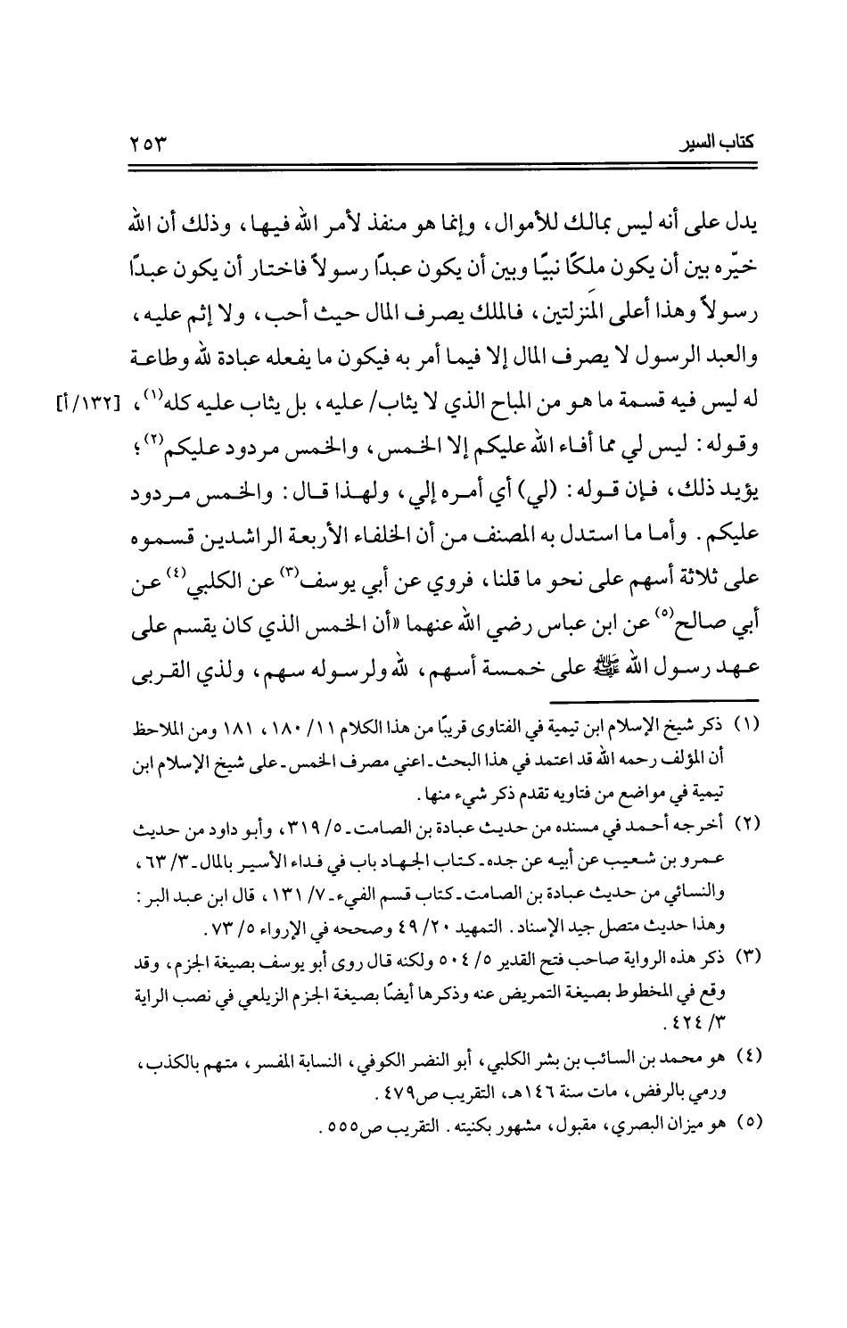 يدل على أنه ليس بمالك للأموال، وإنما هو منفذ لأمر الله فيها، وذلك أن الله خيره بين أن يكون ملكًا نبيًا وبين أن يكون عبدًا رسولاً فاختار أن يكون عبدًا رسولاً وهذا أعلى المنزلتين، فالملك يصرف المال حيث أحب، ولا إثم عليه، والعبد الرسول لا يصرف المال إلا فيما أمر به فيكون ما يفعله عبادة لله وطاعة له ليس فيه قسمة ما هو من المباح الذي لا يثاب عليه، بل يثاب عليه كله، وقوله: ليس لي مما أفاء الله عليكم إلا الخمس، والخمس مردود عليكم؛ يؤيد ذلك، فإن قوله: (لي) أي أمره إلي، ولهذا قال: والخمس مردود عليكم. وأما ما استدل به المصنف من أن الخلفاء الأربعة الراشدين قسموه على ثلاثة أسهم على نحو ما قلنا، فروي عن أبي يوسف عن الكلبي عن أبي صالح عن ابن عباس رضي الله عنهما "أن الخمس الذي كان يقسم على عهد رسول الله -صلى الله عليه وسلم- على خمسة أسهم، لله ولرسوله سهم، ولذي القربى