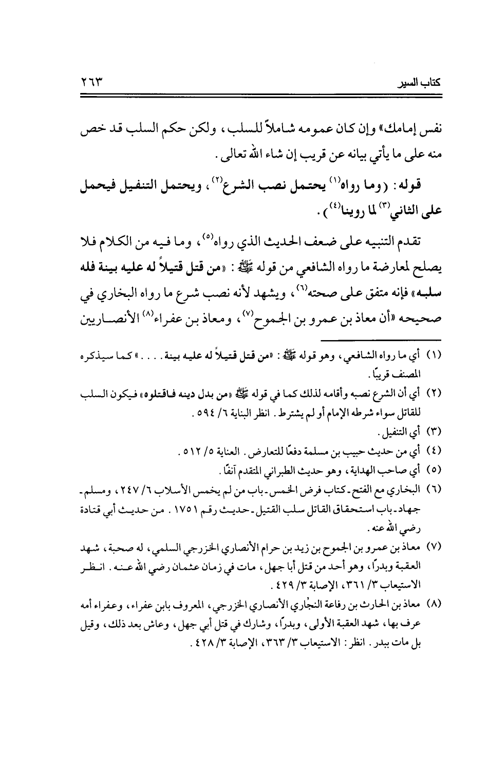 تقدم التنبيه على ضعف الحديث الذي رواه، وما فيه من الكلام فلا يصلح لمعارضة ما رواه الشافعي من قوله -صلى الله عليه وسلم-: "من قتل قتيلاً له عليه بينة فله سلبه" فإنه متفق على صحته، ويشهد لأنه نصب شرع ما رواه البخاري في صحيحه "أن معاذ بن عمرو بن الجموح، ومعاذ بن عفراء الأنصاريين