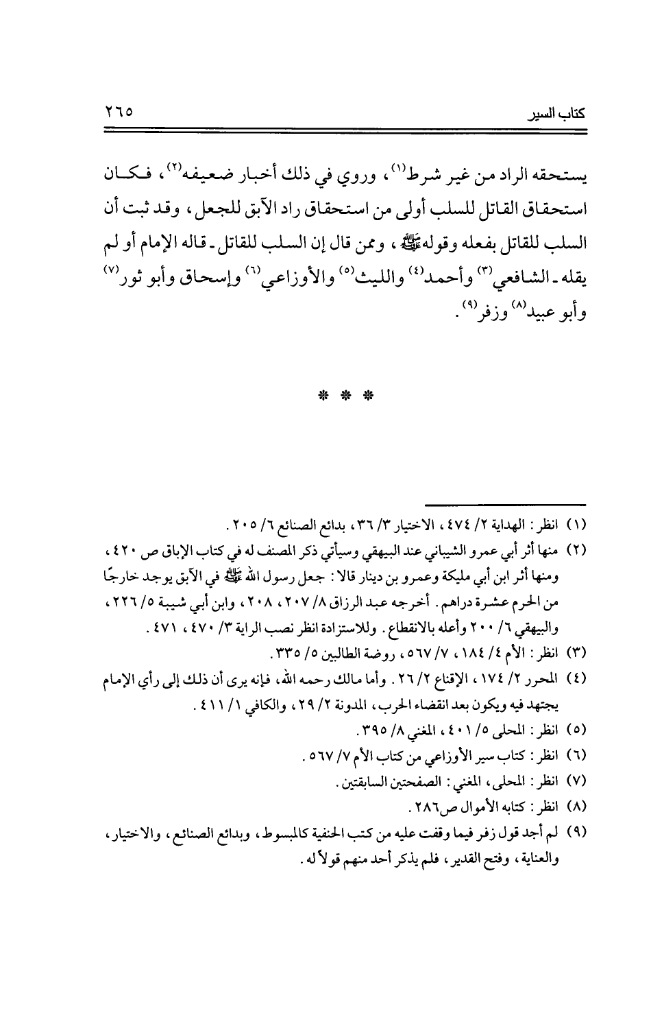 يستحقه الراد من غير شرط، وروي في ذلك أخبار ضعيفه، فكان استحقاق القاتل للسلب أولى من استحقاق راد الآبق للجعل، وقد ثبت أن السلب للقاتل بفعله وقوله -صلى الله عليه وسلم-، وممن قال إن السلب للقاتل -قاله الإمام أو لم يقله- الشافعي وأحمد والليث والأوزاعي وإسحاق وأبو ثور وأبو عبيد وزفر.