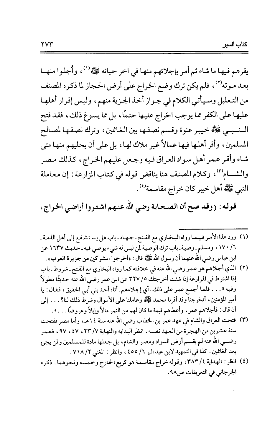 يقرهم فيها ما شاء ثم أمر بإجلائهم منها في آخر حياته -صلى الله عليه وسلم-، وأجلوا منها بعد موته، فلم يكن ترك وضع الخراج على أرض الحجاز لما ذكره المصنف من التعليل وسيأتي الكلام في جواز أخذ الجزية منهم، وليس إقرار أهلها عليها على الكفر مما يوجب الخراج عليها حتمًا، بل مما يسوغ ذلك، فقد فتح النبي -صلى الله عليه وسلم- خيبر عنوة وقسم نصفها بين الغانمين، وترك نصفها لمصالح المسلمين، وأقر أهلها فيها عمالاً غير ملاك لها، بل على أن يجليهم منها متى شاء وأقر عمر أهل سواد العراق فيه وجعل عليهم الخراج، كذلك مصر والشام، وكلام المصنف هنا يناقض قوله في كتاب المزارعة: إن معاملة النبي -صلى الله عليه وسلم- أهل خيبر كان خراج مقاسمة.