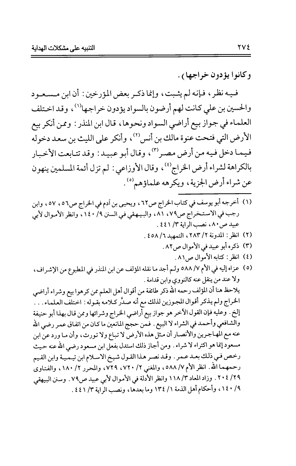 فيه نظر، فإنه لم يثبت، وإنما ذكر بعض المؤرخين: أن ابن مسعود والحسين بن علي كانت لهم أرضون بالسواد يؤدون خراجها، وقد اختلف العلماء في جواز بيع أراضي السواد ونحوها، قال ابن المنذر: وممن أنكر بيع الأرض التي فتحت عنوة مالك بن أنس، وأنكر على الليث بن سعد دخوله فيما دخل فيه من أرض مصر، وقال أبو عبيد: وقد تتابعت الأخبار بالكراهة لشراء أرض الخراج، وقال الأوزاعي: لم تزل أئمة المسلمين ينهون عن شراء أرض الجزية، ويكرهه علماؤهم.