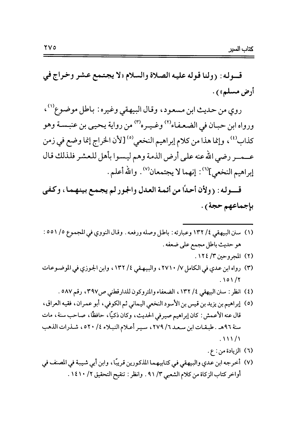 روي من حديث ابن مسعود، وقال البيهقي وغيره: باطل موضوع، ورواه ابن حبان في الضعفاء وغيره من رواية يحيى بن عنبسة وهو كذاب، وإنما هذا من كلام إبراهيم النخعي [لأن الخراج إنما وضع في زمن عمر رضي الله عنه على أرض الذمة وهم ليسوا بأهل للعشر فلذلك قال إبراهيم النخعي]: إنهما لا يجتمان. والله أعلم.