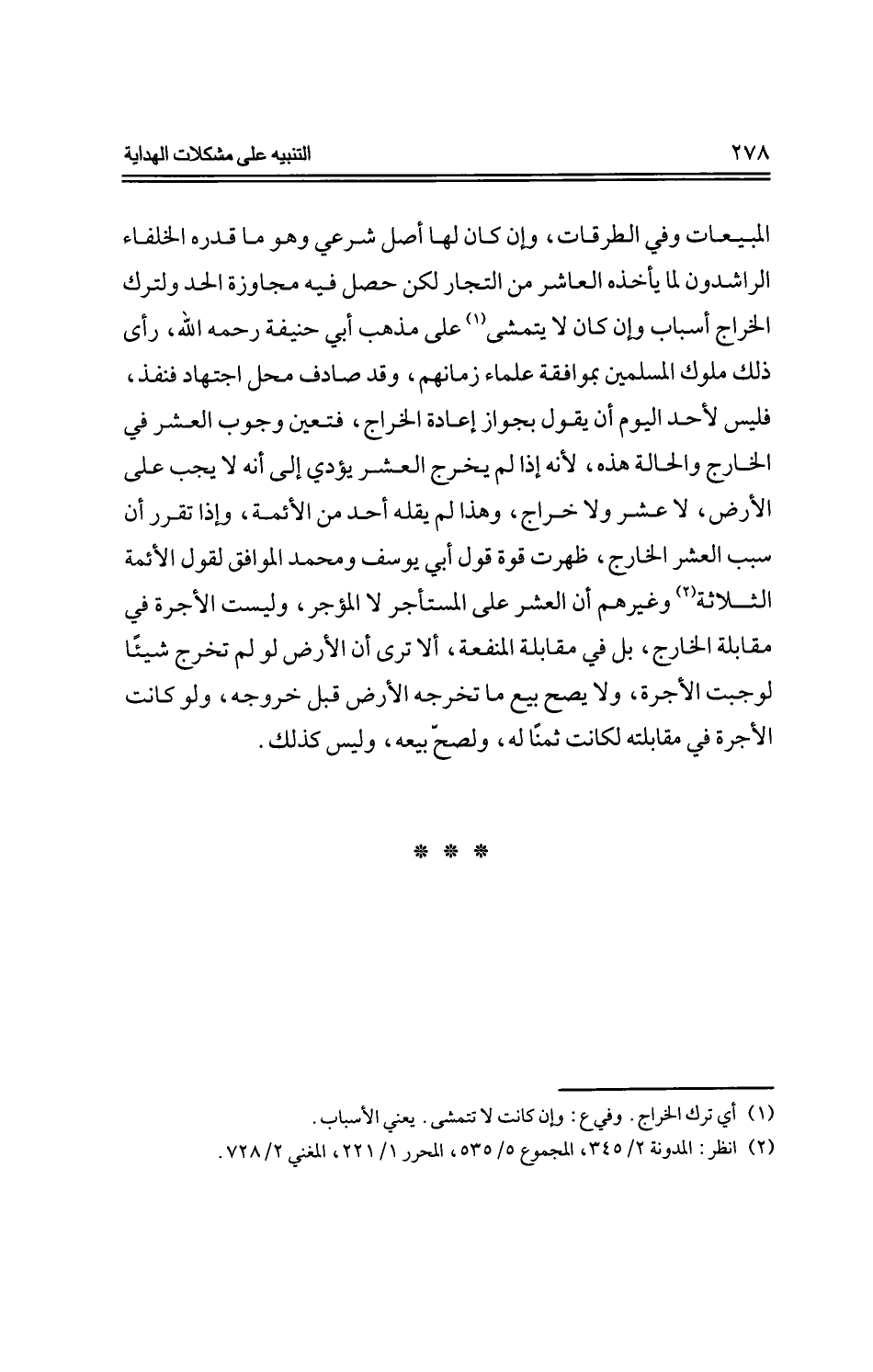 المبيعات وفي الطرقات، وإن كان لها أصل شرعي وهو ما قدره الخلفاء الراشدون لما يأخذه العاشر من التجار لكن حصل فيه مجاوزة الحد ولترك الخراج أسباب وإن كان لا يتمشى على مذهب أبي حنيفة رحمه الله، رأى ذلك ملوك المسلمين بموافقة علماء زمانهم، وقد صادف محل اجتهاد فنفذ، فليس لأحد اليوم أن يقول بجواز إعادة الخراج، فتعين وجوب العشر في الخارج والحالة هذه، لأنه إذا لم يخرج العشر يؤدي إلى أنه لا يجب على الأرض، لا عشر ولا خراج، وهذا لم يقله أحد من الأئمة، وإذا تقرر أن سبب العشر الخارج، ظهرت قوة قول أبي يوسف ومحمد الموافق لقول الأئمة الثلاثة وغيرهم أن العشر على المستأجر لا المؤجر، وليست الأجرة في مقابلة الخارج، بل في مقابلة المنفعة، ألا ترى أن الأرض لو لم تخرج شيئًا لوجبت الأجرة، ولا يصح بيع ما تخرجه الأرض قبل خروجه، ولو كانت الأجرة في مقابلته لكانت ثمنًا له، ولصح بيعه، وليس كذلك.