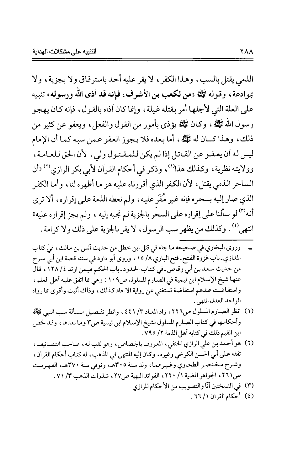 الذمي يقتل بالسب، وهذا الكفر، لا يقر عليه أحد باسترقاق ولا بجزية، ولا بموادعة، وقوله -صلى الله عليه وسلم- "من لكعب بن الأشرف، فإنه قد آذى الله ورسوله" تنبيه على العلة التي لأجلها أمر بقتله غيلة، وإنما كان آذاه بالقول، فإنه كان يهجو رسول الله -صلى الله عليه وسلم، وكان -صلى الله عليه وسلم- يؤذى بأمور من القول والفعل، ويعفو عن كثير من ذلك، وهذا كان له -صلى الله عليه وسلم-، أما بعده فلا يجوز العفو عمن سبه كما أن الإمام ليس له أن يعفو عن القاتل إذا لم يكن للمقتول ولي، لأن الحق للعامة، وولايته نظرية، وكذلك هذا، وذكر في أحكام القرآن لأبي بكر الرزاي "أن الساحر الذمي يقتل، لأن الكفر الذي أقررناه عليه هو ما أظهره لنا، وأما الكفر الذي صار إليه بسحره فإنه غير مقر عليه، ولم نعطه الذمة على إقراره، ألا ترى أنه لو سألنا على إقراره على السحر بالجزية لم نجبه إليه، ولم يجز إقراره عليه" انتهى. وكذلك من يظهر سب الرسول، لا يقر بالجزية على ذلك ولا كرامة.