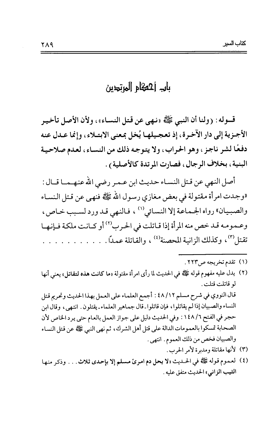 أصل النهي عن قتل النساء حديث ابن عمر رضي الله عنهما قال: "وجدت امرأة مقتولة في بعض مغازي رسول الله -صلى الله عليه وسلم- فنهى عن قتل النساء والصبيان" رواه الجماعة إلا النسائي، فالنهي قد ورد لسبب خاص، وعمومه قد خص منه المرأة إذا قاتلت في الحرب أو كانت ملكة فإنها تقتل، وكذلك الزانية المحصنة، والقاتلة عمدًا ................