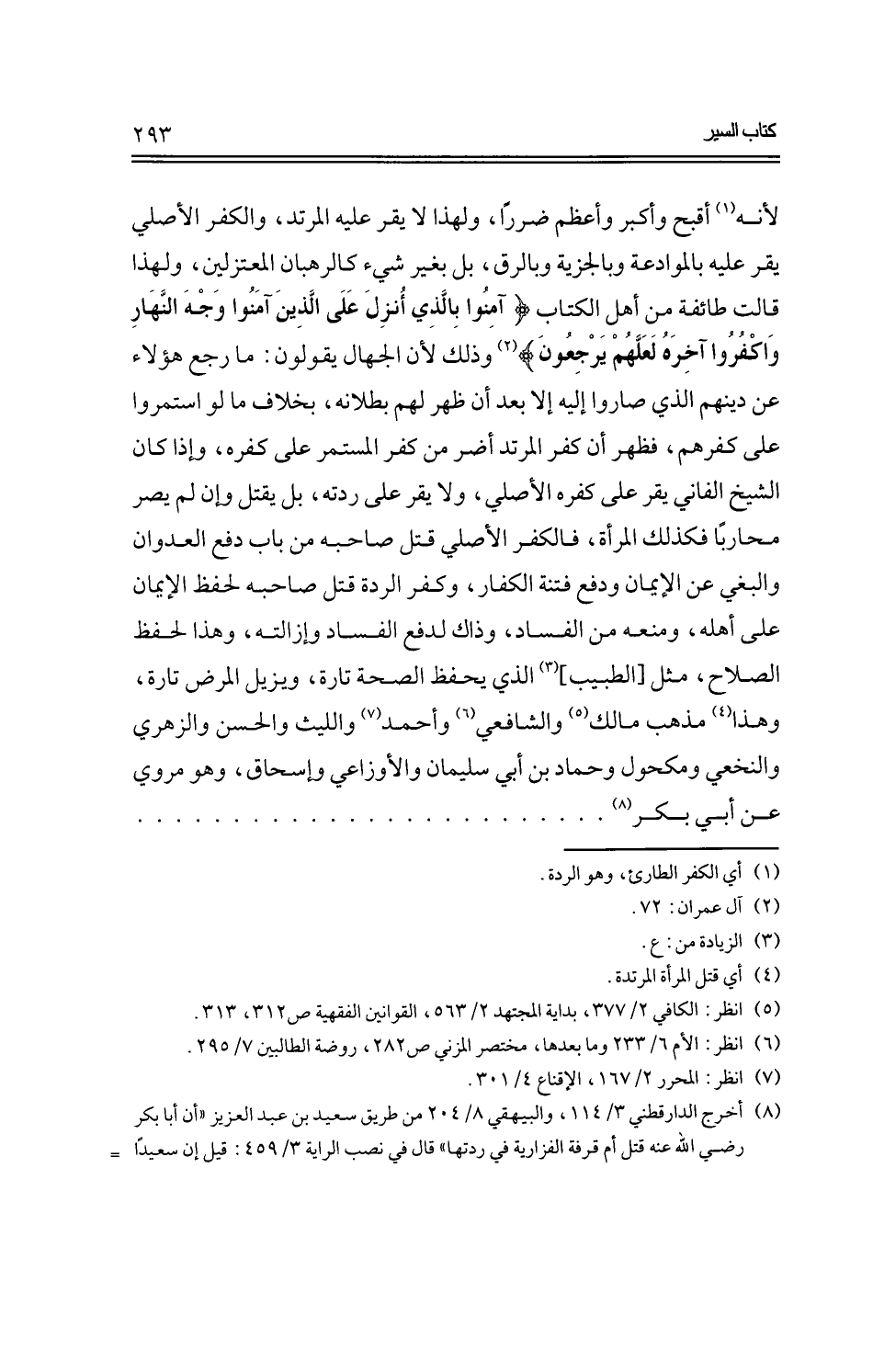 لأنه أقبح وأكبر وأعظم ضررًا، ولهذا لا يقر عليه المرتد، والكفر الأصلي يقر عليه بالموادعة وبالجزية وبالرق، بل بغير شيء كالرهبان المعتزلين، ولهذا قالت طائفة من أهل الكتاب {آمنوا بالذي أنزل على الذين آمنوا وجه النهار واكفروا آخره لعلهم يرجعون} وذلك لأن الجهال يقولون: ما رجع هؤلاء عن دينهم الذي صاروا إليه إلا بعد أن ظهر لهم بطلانه، بخلاف ما لو استمروا على كفرهم، فظهر أن كفر المرتد أضر من كفر المستمر على كفره، وإذا كان الشيخ الفاني يقر على كفره الأصلي، ولا يقر على ردته، بل يقتل وإن لم يصر محاربًا فكذلك المرأة، فالكفر الأصلي قتل صاحبه من باب دفع العدوان والبغي عن الإيمان ودفع فتنة الكفار، وكفر الردة قتل صاحبه لحفظ الإيمان على أهله، ومنعه من الفساد، وذاك لدفع الفساد وإزالته، وهذا لحفظ الصلاح، مثل [الطبيب] الذي يحفظ الصحة تارة، ويزيل المرض تارة، وهذا مذهب مالك والشافعي وأحمد والليث والحسن والزهري والنخعي ومكحول وحماد بن أبي سليمان والأوزاعي وإسحاق، وهو مروي عن أبي بكر .........................................