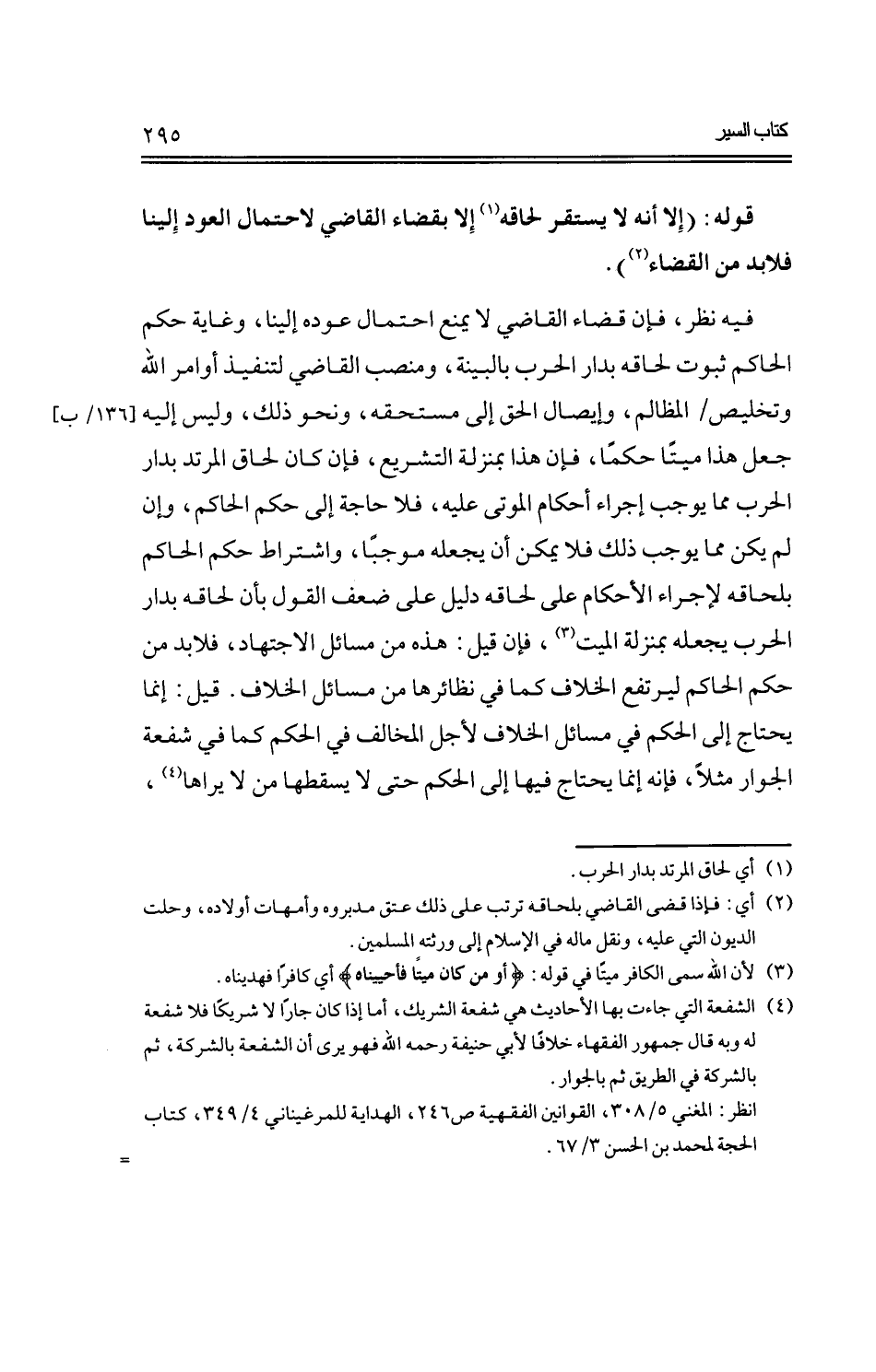 فيه نظر، فإن قضاء القاضي لا يمنع احتمال عوده إلينا، وغاية حكم الحاكم ثبوت لحاقه بدار الحرب بالبينة، ومنصب القاضي لتنفيذ أوامر الله وتخليص المظالم، وإيصال الحق إلى مستحقه، ونحو ذلك، وليس إليه جعل هذا ميتًا حكمًا، فإن هذا بمنزلة التشريع، فإن كان لحاق المرتد بدار الحرب مما يوجب إجراء أحكام الموتى عليه، فلا حاجة إلى حكم الحاكم، وإن لم يكن مما يوجب ذلك فلا يمكن أن يجعله موجبًا، واشتراط حكم الحاكم بلحاقه لإجراء الأحكام على لحاقه دليل على ضعف القول بأن لحاقه بدار الحرب يجعله بمنزلة الميت، فإن قيل: هذه من مسائل الاجتهاد، فلابد من حكم الحاكم ليرتفع الخلاف كما في نظائرها من مسائل الخلاف. قيل: إنما يحتاج إلى الحكم في مسائل الخلاف لأجل المخالف في الحكم كما في شفعة الجوار مثلاً، فإنه إنما يحتاج فيها إلى الحكم حتى لا يسقطها من لا يراها،