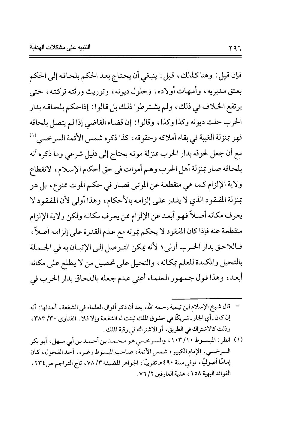 فإن قيل: وهنا كذلك، قيل: ينبغي أن يحتاج بعد الحكم بلحاقه إلى الحكم بعتق مدبريه، وأمهات أولاده، وحلول ديونه، وتوريث ورثته تركته، حتى يرتفع الخلاف في ذلك، ولم يشترطوا ذلك بل قالوا: إذا حكم بلحاقه بدار الحرب حلت ديونه وكذا وكذا، وقالوا: إن قضاء القاضي إذا لم يتصل بلحاقه فهو بمنزلة الغيبة في بقاء أملاكه وحقوقه، كذا ذكره شمس الأئمة السرخسي مع أن جعل لحوقه بدار الحرب بمنزلة موته يحتاج إلى دليل شرعي وما ذكره أنه بلحاقه صار بمنزلة أهل الحرب وهم أموات في حق أحكام الإسلام، لانقطاع ولاية الإلزام كما هي منقطعة عن الموتى فصار في حكم الموت ممنوع، بل هو بمنزلة المفقود الذي لا يقدر على إلزامه بالأحكام، وهذا أولى لأن المفقود لا يعرف مكانه أصلاً فهو أبعد عن الإلزام ممن يعرف مكانه ولكن ولاية الإلزام منقطعة عنه فإذا كان المفقود لا يحكم بموته مع عدم القدرة على إلزامه أصلاً، فاللاحق بدار الحرب أولى؛ لأنه يمكن التوصل إلى الإتيان به في الجملة بالتحيل والمكيدة للعلم بمكانه، والتحيل على تحصيل من لا يطلع على مكانه أبعد، وهذا قول جمهور العلماء أعني عدم جعله باللحاق بدار الحرب في