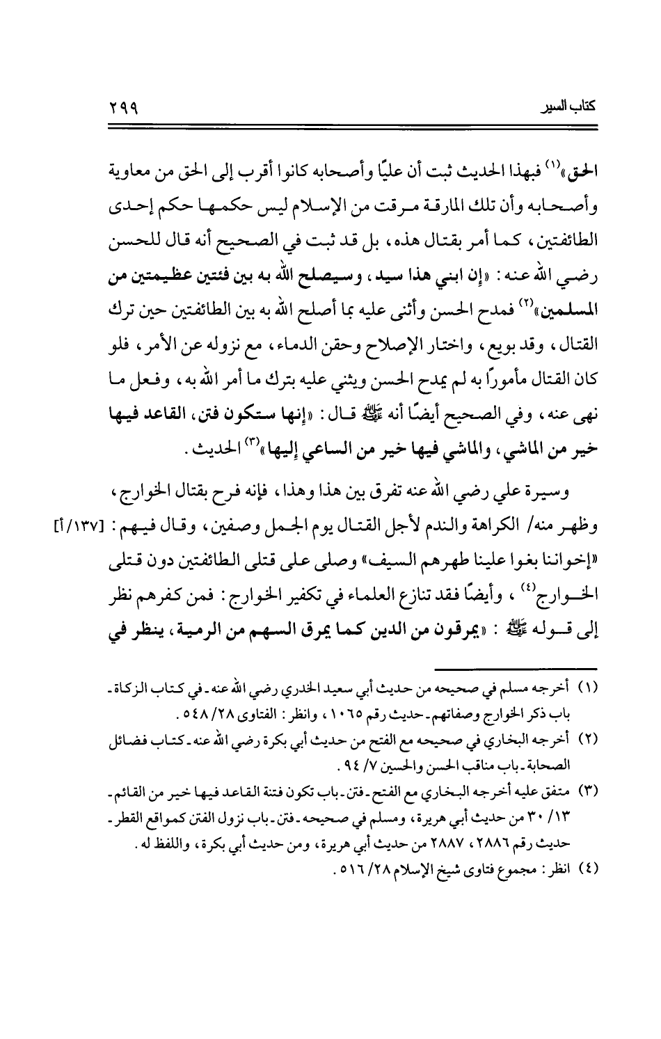 الحق" فبهذا الحديث ثبت أن عليًا وأصحابه كانوا أقرب إلى الحق من معاوية وأصحابه وأن تلك المارقة مرقت من الإسلام ليس حكمها حكم إحدى الطائفتين، كما أمر بقتال هذه، بل قد ثبت في الصحيح أنه قال للحسن رضي الله عنه: "إن ابني هذا سيد، وسيصلح الله به بين فئتين عظيمتين من المسلمين" فمدح الحسن وأثنى عليه بما أصلح الله به بين الطائفتين حين ترك القتال، وقد بويع، واختار الإصلاح وحقن الدماء، مع نزوله عن الأمر، فلو كان القتال مأمورًا به لم يمدح الحسن ويثني عليه بترك ما أمر الله به، وفعل ما نهى عنه، وفي الصحيح أيضًا أنه -صلى الله عليه وسلم- قال: "إنها ستكون فتن، القاعد فيها خير من الماشي، والماشي فيها خير من الساعي إليها" الحديث.