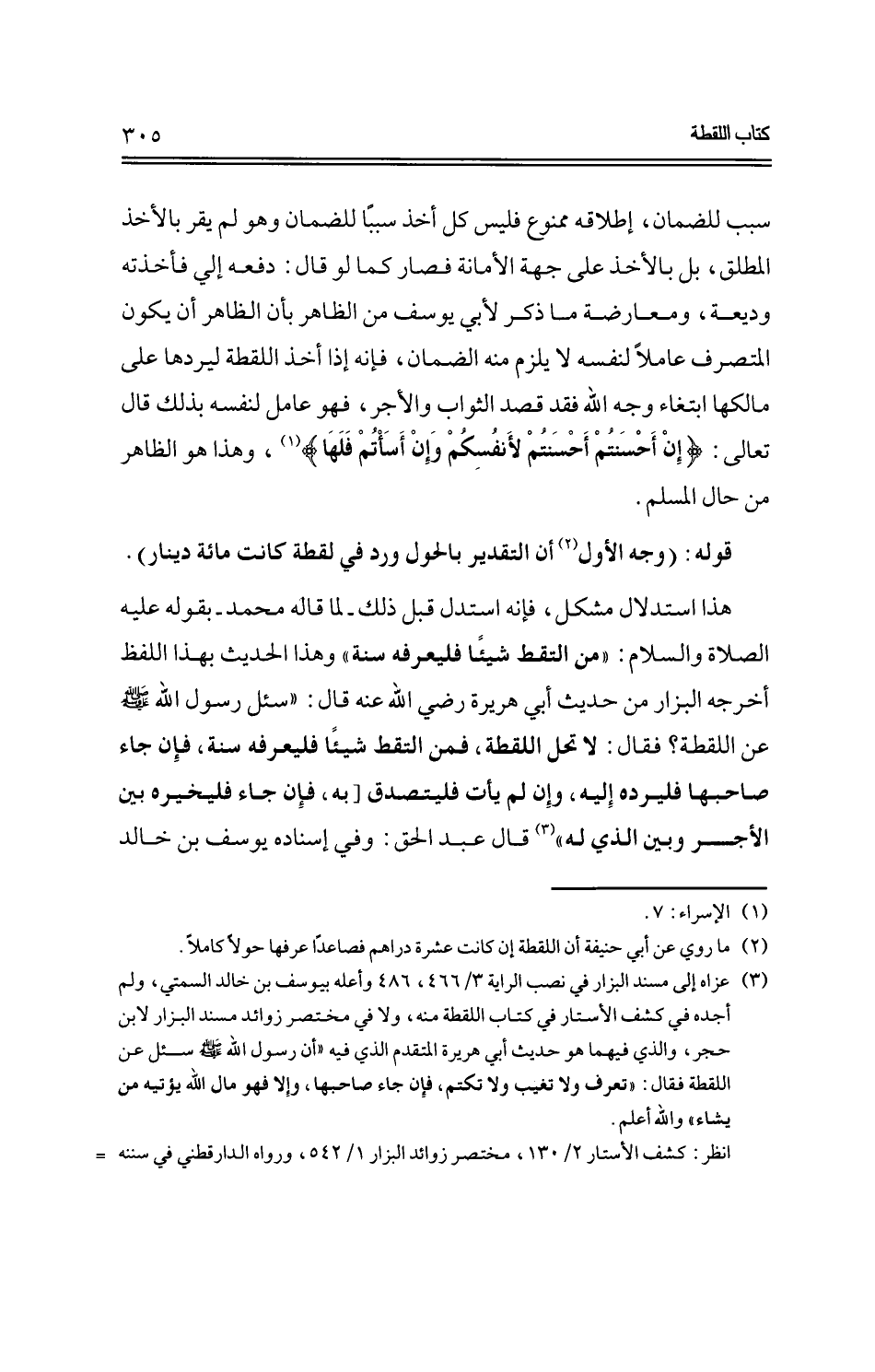 هذا استدلال مشكل، فإنه استدل قبل ذلك -لما قاله محمد- بقوله عليه الصلاة والسلام. "من التقط شيئًا فليعرفه سنة" وهذا الحديث بهذا اللفظ أخرجه البزار من حديث أبي هريرة رضي الله عنه قال: "سئل رسول الله -صلى الله عليه وسلم- عن اللقطة؟ فقال: لا تحل اللقطة، فمن التقط شيئًا فليعرفه سنة، فإن جاء صاحبها فليرده إليه، وإن لم يأت فليتصدق [به، فإن جاء فليخيره بين الأجر وبين الذي له" قال عبد الحق: وفي إسناده يوسف بن خالد