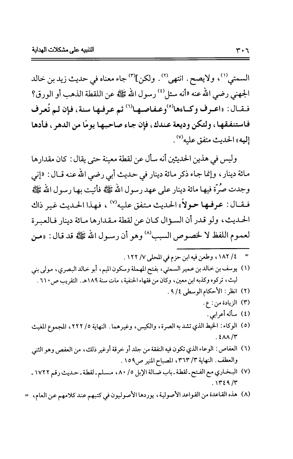 وليس في هذين الحديثين أنه سأل عن لقطة معينة حتى يقال: كان مقدارها مائة دينار، وإنما جاء ذكر مائة دينار في حديث أبي رضي الله عنه قال: "إني وجدت صرة فيها مائة دينار على عهد رسول الله -صلى الله عليه وسلم- فأتيت بها رسول الله -صلى الله عليه وسلم- فقال: عرفها حولاً" الحديث متفق عليه، فهذا الحديث غير ذاك الحديث، ولو قدر أن السؤال كان على لقطة مقدارها مائة دينار فالعبرة لعموم اللفظ لا لخصوص السبب وهو أن رسول الله -صلى الله عليه وسلم- قد قال: "من