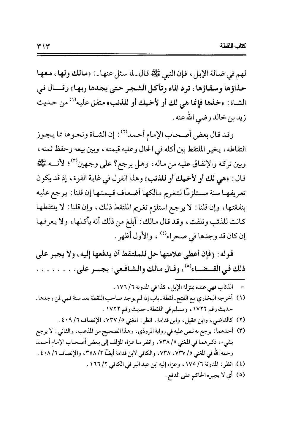لهم في ضالة الإبل، فإن النبي -صلى الله عليه وسلم- قال- لما سئل عنها-: "مالك ولها، معها حذاؤها وسقاؤها، ترد الماء وتأكل الشجر حتى يجدها ربها" وقال في الشاة: "خذها فإنما هي لك أو لأخيك أو للذئب" متفق عليه من حديث زيد بن خالد رضي الله عنه.