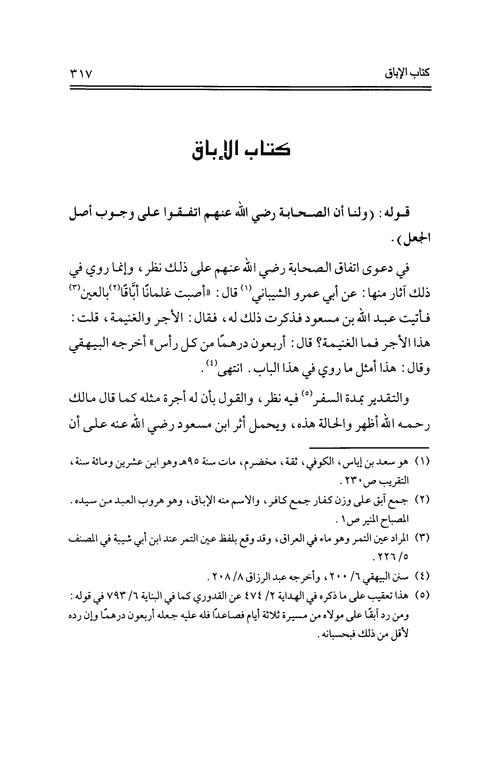 في دعوى اتفاق الصحابة رضي الله عنهم على ذلك نظر، وإنما روي في ذلك آثار منها: عن أبي عمرو الشيباني قال: "أصبت غلمانًا أباقًا بالعين فأتيت عبد الله بن مسعود فذكرت ذلك له، فقال: الأجر والغنيمة، قلت: هذا الأجر فما الغنيمة؟ قال: أربعون درهمًا من كل رأس" أخرجه البيهقي وقال: هذا أمثل ما روي في هذا الباب. انتهى.