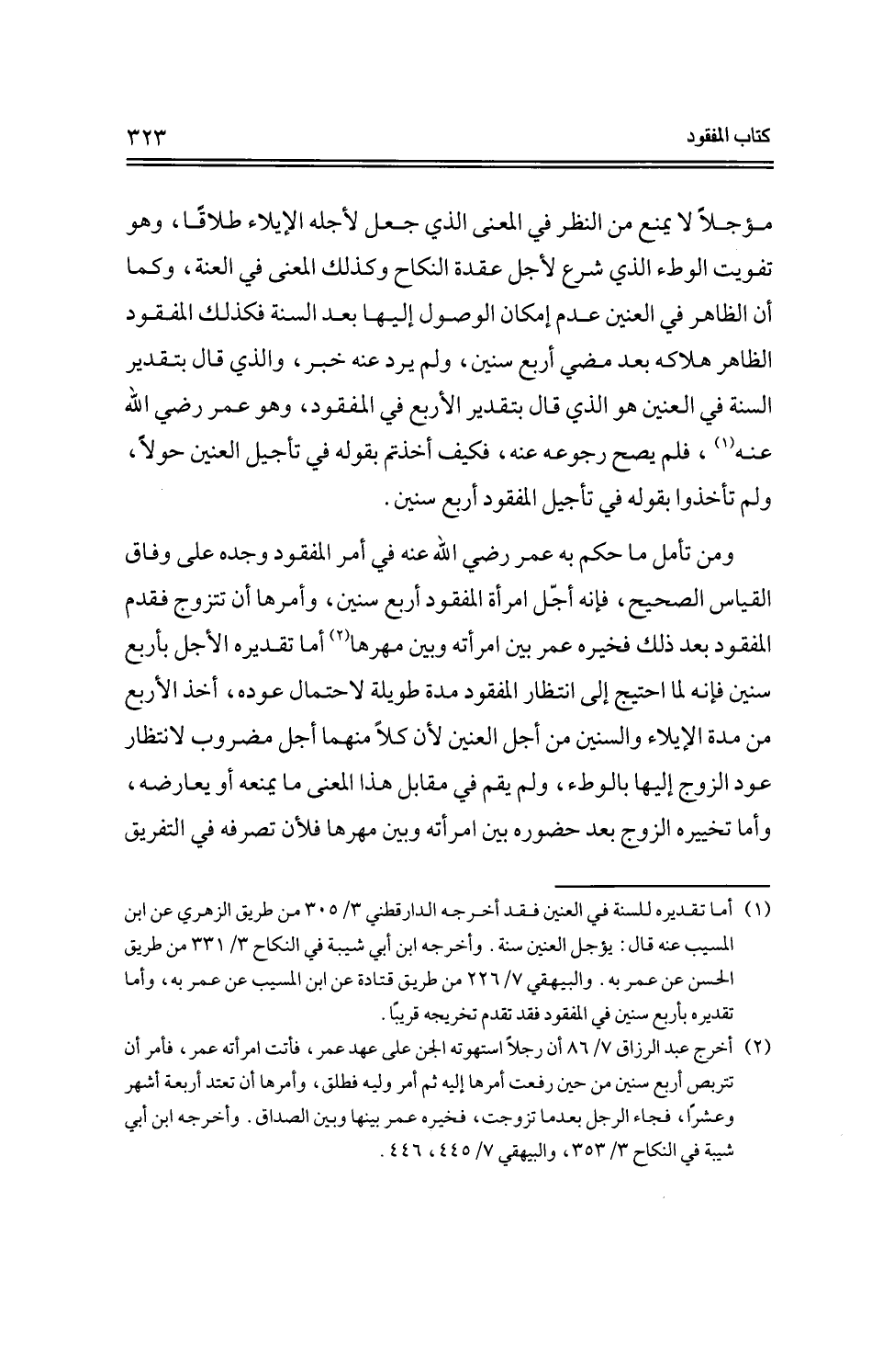 مؤجلاً لا يمنع من النظر في المعنى الذي جعل لأجله الإيلاء طلاقًا، وهو تفويت الوطء الذي شرع لأجل عقدة النكاح وكذلك المعنى في العنة، وكما أن الظاهر في العنين عدم إمكان الوصول إليها بعد السنة فكذلك المفقود الظاهر هلاكه بعد مضي أربع سنين، ولم يرد عنه خبر، والذي قال بتقدير السنة في العنين هو الذي قال بتقدير الأربع في المفقود، وهو عمر رضي الله عنه، فلم يصح رجوعه عنه، فكيف أخذتم بقوله في تأجيل العنين حولاً، ولم تأخذوا بقوله في تأجيل المفقود أربع سنين.
