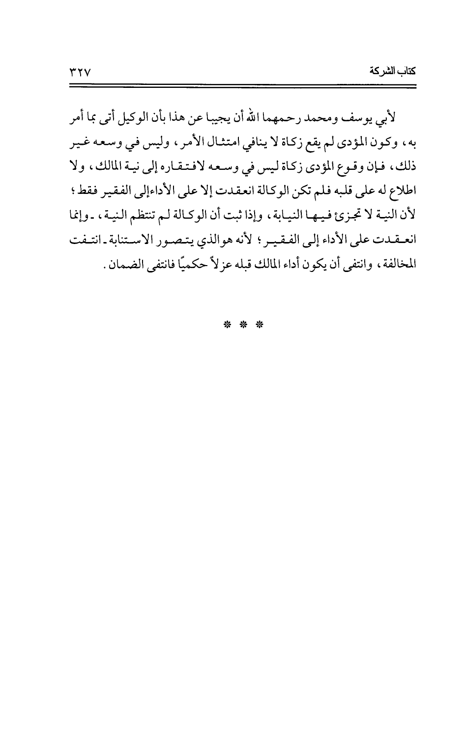 لأبي يوسف ومحمد رحمهما الله أن يجيبا عن هذا بأن الوكيل أتى بما أمر به، وكون المؤدى لم يقع زكاة لا ينافي امتثال الأمر، وليس في وسعه غير ذلك، فإن وقوع المؤدى زكاة ليس في وسعه لافتقاره إلى نية المالك، ولا اطلاع له على قلبه فلم تكن الوكالة انعقدت إلا على الأداء إلى الفقير فقط؛ لأن النية لا تجزئ فيها النيابة، وإذا ثبت أن الوكالة لم تنتظم النية، -وإنما انعقدت على الأداء إلى الفقير؛ لأنه هو الذي يتصور الاستنابة- انتفت المخالفة، وانتفى أن يكون أداء المالك قبله عزلاً حكميًا فانتفى الضمان.