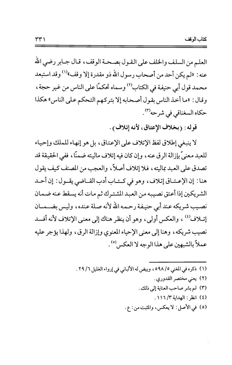 العلم من السلف والخلف على القول بصحة الوقف، قال جابر رضي الله عنه: "لم يكن أحد من أصحاب رسول الله ذو مقدرة إلا وقف" وقد استبعد محمد قول أبي حنيفة في الكتاب وسماه تحكمًا على الناس من غير حجة، وقال: "ما أخذ الناس بقول أصحابه إلا بتركهم التحكم على الناس" هكذا حكاه السغناقي في شرحه.
