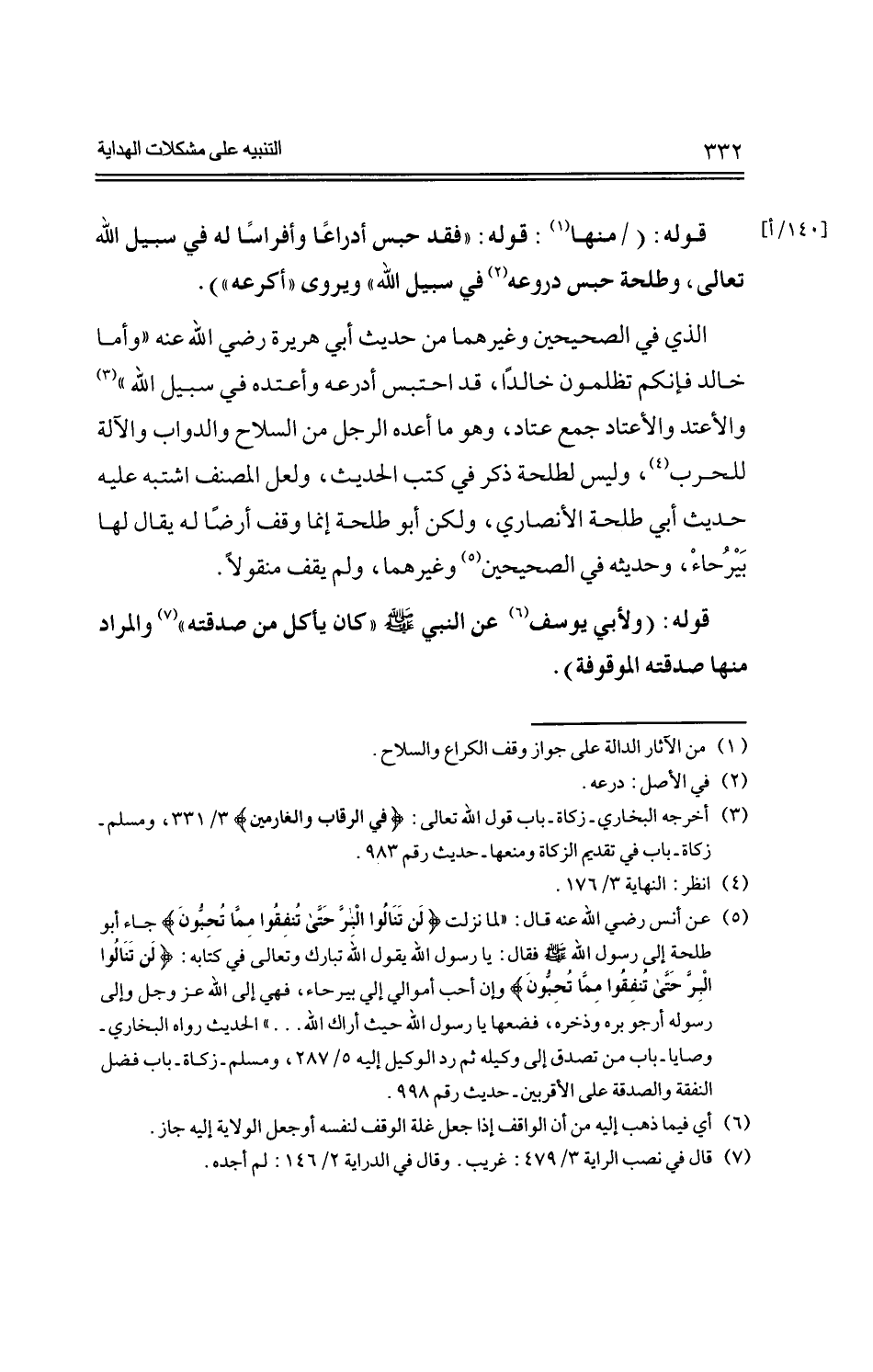 الذي في الصحيحين وغيرهما من حديث أبي هريرة رضي الله عنه "وأما خالد فإنكم تظلمون خالدًا، قد احتبس أدرعه وأعتده في سبيل الله" والأعتد والأعتاد جمع عتاد، وهو ما أعده الرجل من السلاح والدواب والآلة للحرب، وليس لطلحة ذكر في كتب الحديث، ولعل المصنف اشتبه عليه حديث أبي طلحة الأنصاري، ولكن أبو طلحة إنما وقف أرضًا له يقال لها بيرحاء، وحديثه في الصحيحين وغيرهما، ولم يقف منقولاً.