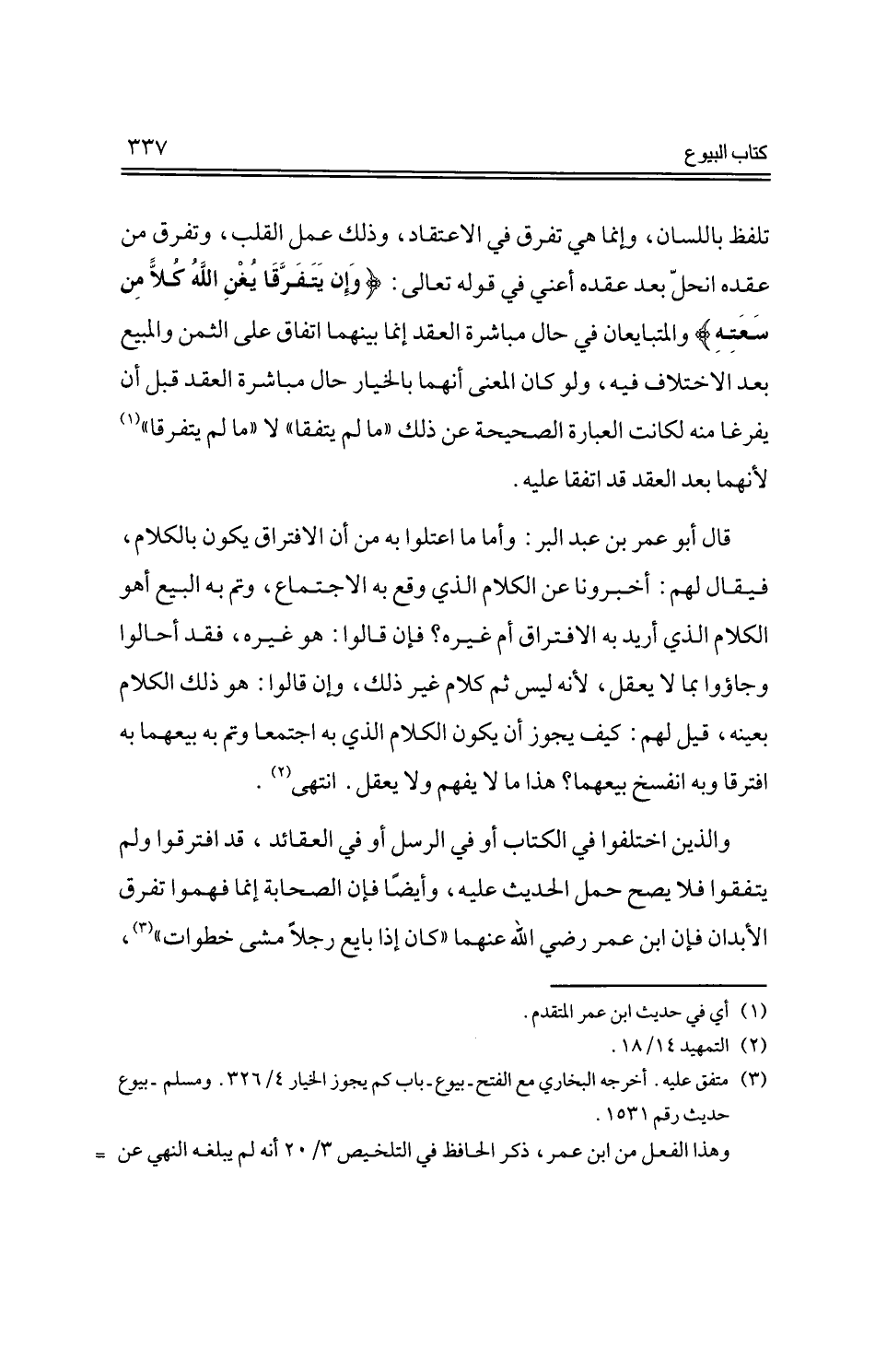 قال أبو عمر بن عبد البر: وأما ما اعتلوا به من أن الافتراق يكون بالكلام، فيقال لهم: أخبرونا عن الكلام الذي وقع به الاجتماع، وتم به البيع أهو الكلام الذي أريد به الافتراق أم غيره؟ فإن قالوا: هو غيره، فقد أحالوا وبجاؤوا بما لا يعقل، لأنه ليس ثم كلام غير ذلك، وإن قالوا: هو ذلك الكلام بعينه، قيل لهم: كيف يجوز أن يكون الكلام الذي به اجتمعا وتم به بيعهما به افترقا وبه انفسخ بيعهما؟ هذا ما لا يفهم ولا يعقل. انتهى.