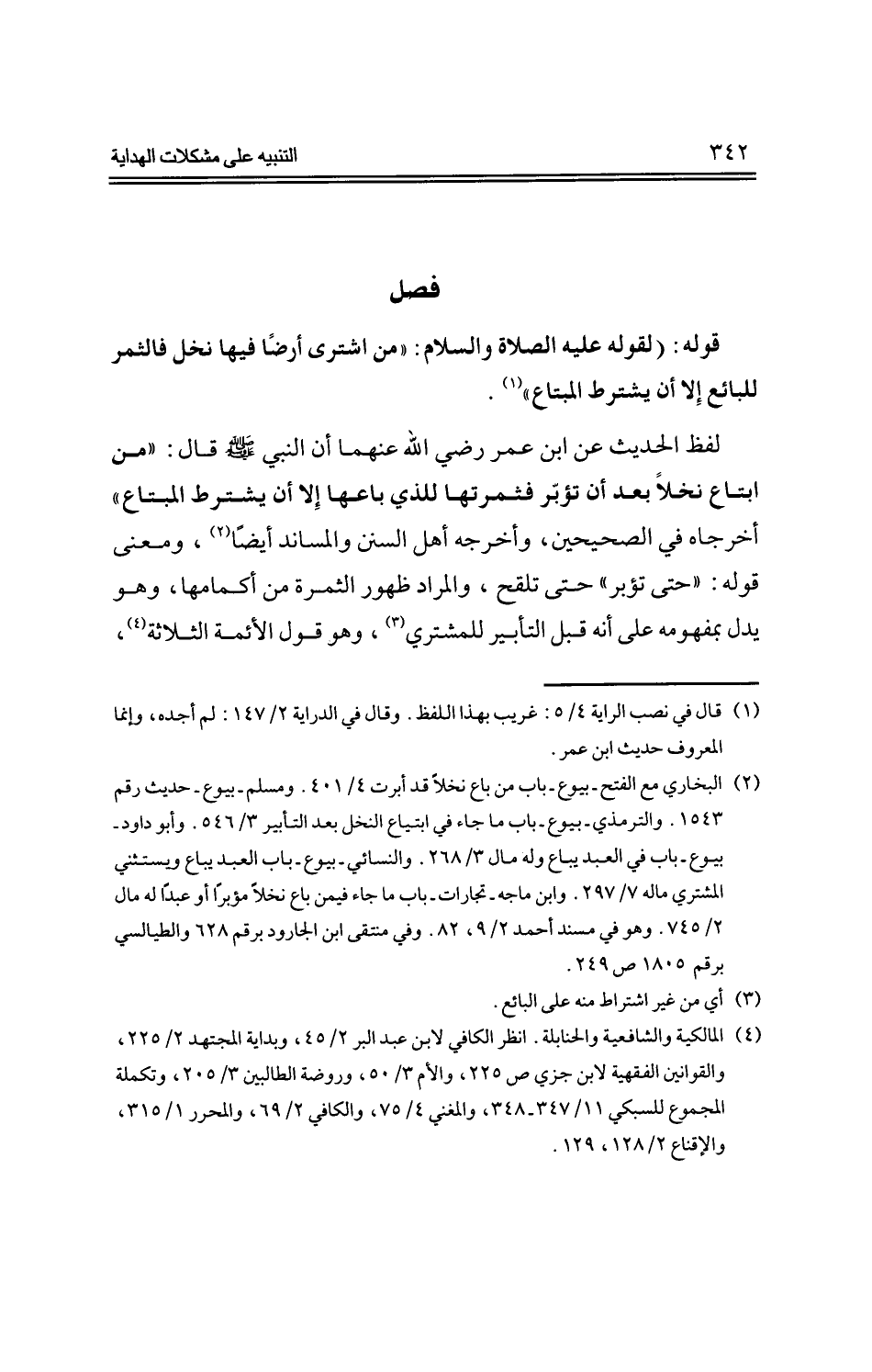 لفظ الحديث عن ابن عمر رضي الله عنهما أن النبي -صلى الله عليه وسلم- قال: "من ابتاع نخلاً بعد أن تؤبر فثمرتها للذي باعها إلا أن يشترط المبتاع" أخرجاه في الصحيحين، وأخرجه أهل السنن والمساند أيضًا، ومعنى قوله: "حتى تؤبر" حتى تلقح، والمراد ظهور الثمرة من أكمامها، وهو يدل بمفهومه على أنه قبل التأبير للمشتري، وهو قول الأئمة الثلاثة،