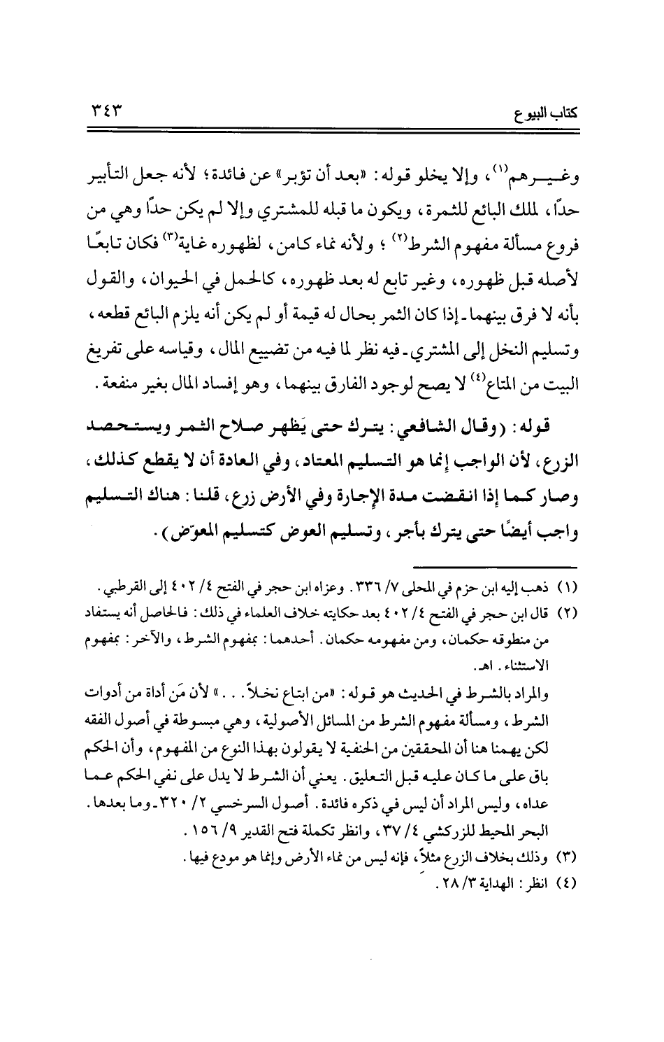 وغيرهم، وإلا يخلو قوله: "بعد أن تؤبر" عن فائدة؛ لأنه جعل التأبير حدًا، لملك البائع للثمرة، ويكون ما قبله للمشتري وإلا لم يكن حدًا وهي من فروع مسألة مفهوم الشرط؛ ولأنه نماء كامن، لظهوره غاية فكان تابعًا لأصله قبل ظهوره، وغير تابع له بعد ظهوره، كالحمل في الحيوان، والقول بأنه لا فرق بينهما - إذا كان الثمر بحال له قيمة أو لم يكن أنه يلزم البائع قطعه، وتسليم النخل إلى المشتري- فيه نظر لما فيه من تضييع المال، وقياسه على تفريغ البيت من المتاع لا يصح لوجود الفارق بينهما، وهو إفساد المال بغير منفعة.