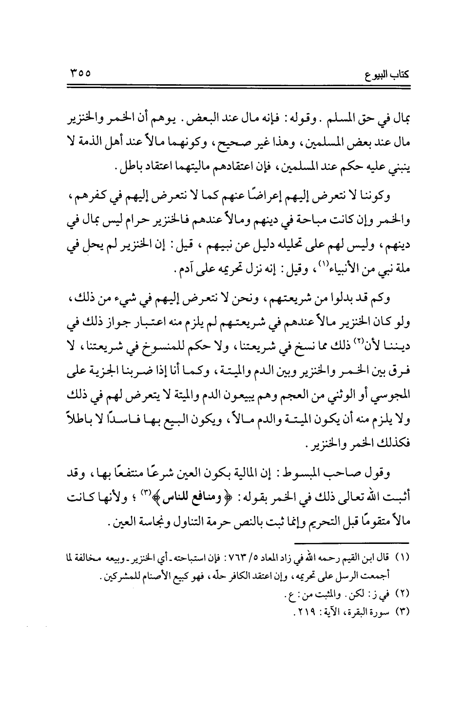 وقول صاحب المبسوط: إن المالية بكون العين شرعاً منتفعاً بها، وقد أثبت الله تعالى ذلك في الخمر بقوله: {ومنافع للناس}؛ ولأنها كانت مالاً متقوماً قبل التحريم وإنما ثبت بالنص حرمة التناول ونجاسة العين.