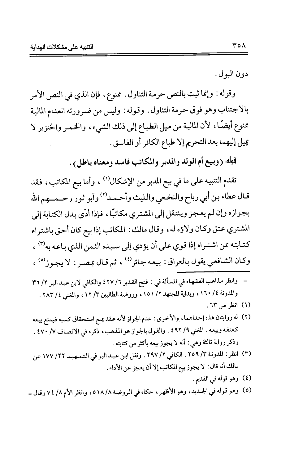 تقدم التنبيه على ما في بيع المدبر من الإشكال، وأما بيع المكاتب، فقد قال عطاء بن أبي رباح والنخعي والليث وأحمد، وأبو ثور رحمهم الله بجوازه وإن لم يعجز وينتقل إلى المشتري مكاتباً، فإذا أدى بدل الكتابة إلى المشتري عتق وكان ولاؤه له، وقال مالك: المكاتب إذا بيع كان أحق باشتراء كتابته ممن اشتراه إذا قوي على أن يؤدي إلى سيده الثمن الذي باعه به، وكان الشافعي يقول بالعراق: بيعه جائز، ثم قال بمص: لا يجوز،