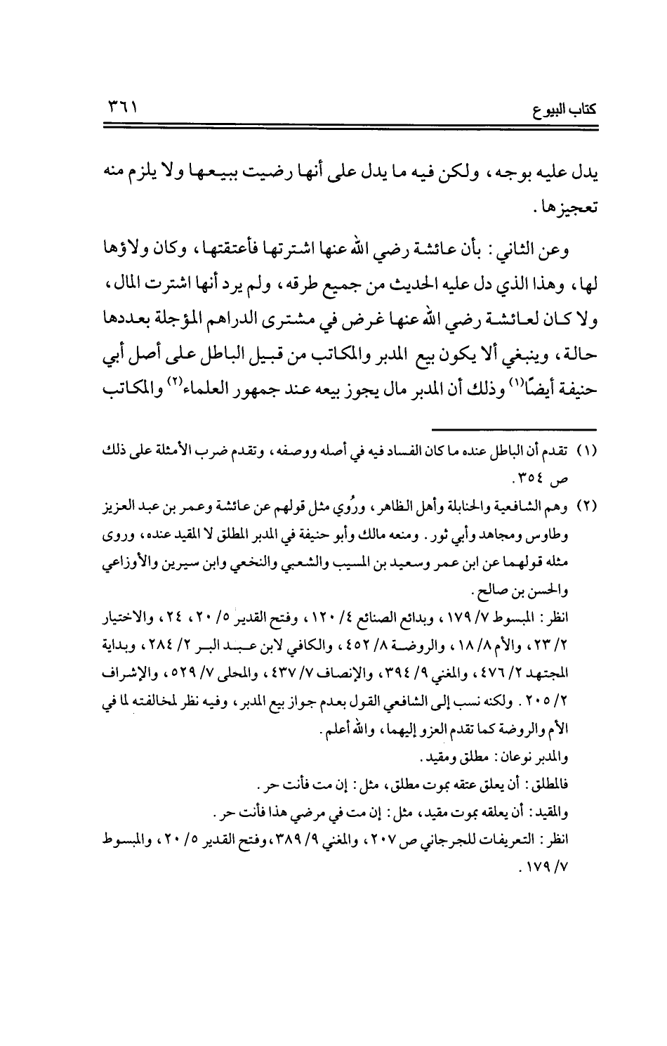 وعن الثاني: بأن عائشة رضي الله عنها اشترتها فأعتقتها، وكان ولاؤها لها، وهذا الذي دل عليه الحديث من جميع طرقه، ولم يرد أنها اشترت المال، ولا كان لعائشة رضي الله عنها غرض في مشترى الدراهم المؤجلة بعددها حالة، وينبغي ألا يكون بيع المدبر والمكاتب من قبيل الباطل على أصل أبي حنيفة أيضاً وذلك أن المدبر مال يجوز بيعه عند جمهور العلماء والمكاتب