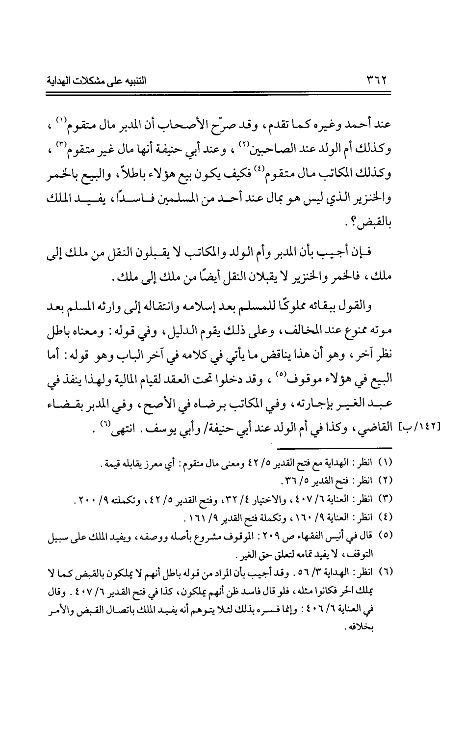 والقول ببقائه مملوكاً للمسلم بعد إسلامه وانتقاله إلى وارثه المسلم بعد موته ممنوع عند المخالف، وعلى ذلك يقوم الدليل، وفي قوله: ومعناه باطل نظر آخر، وهو أن هذا يناقض ما يأتي في كلامه في آخر الباب وهو قوله: أما البيع في هؤلاء موقوف، وقد دخلوا تحت العقد لقيام المالية ولهذا ينفذ في عبد الغير بإجارته، وفي المكاتب برضاه في الأصح، وفي المدبر بقضاء القاضي، وكذا في أم الولد عند أبي حنيفة/ وأبي يوسف. انتهى.