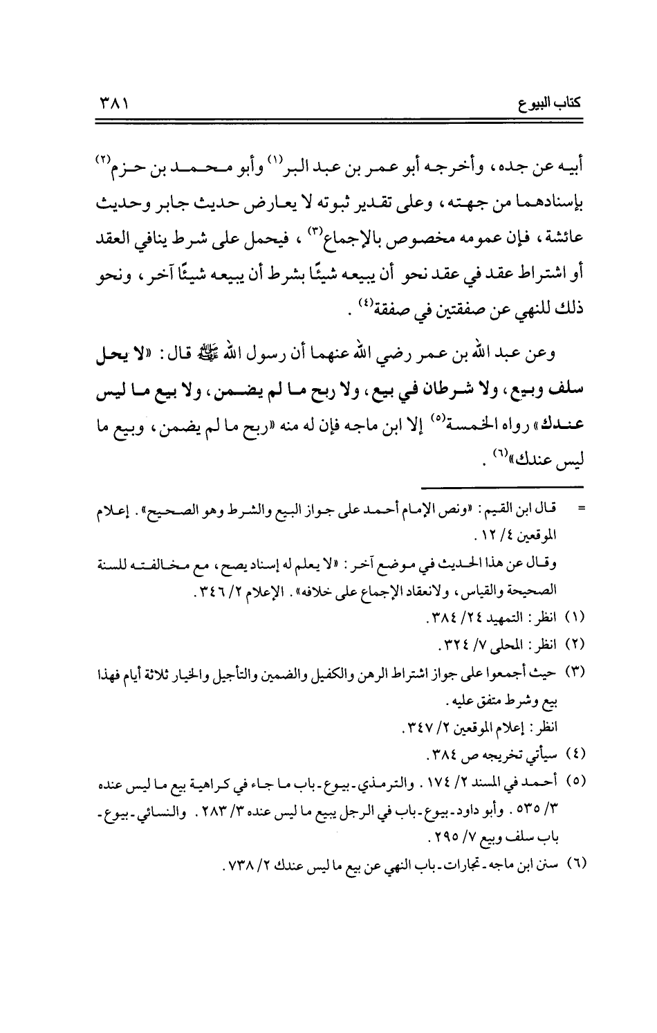 وعن عبد الله بن عمر رضي الله عنهما أن رسول الله -صلى الله عليه وسلم- قال: "لا يحل سلف وبيع، ولا شرطان في بيع، ولا ربح ما لم يضمن، ولا بيع ما ليس عند" رواه الخمسة إلا ابن ماجة فإن له منه "ربح ما لم يضمن، وبيع ما ليس عندك".