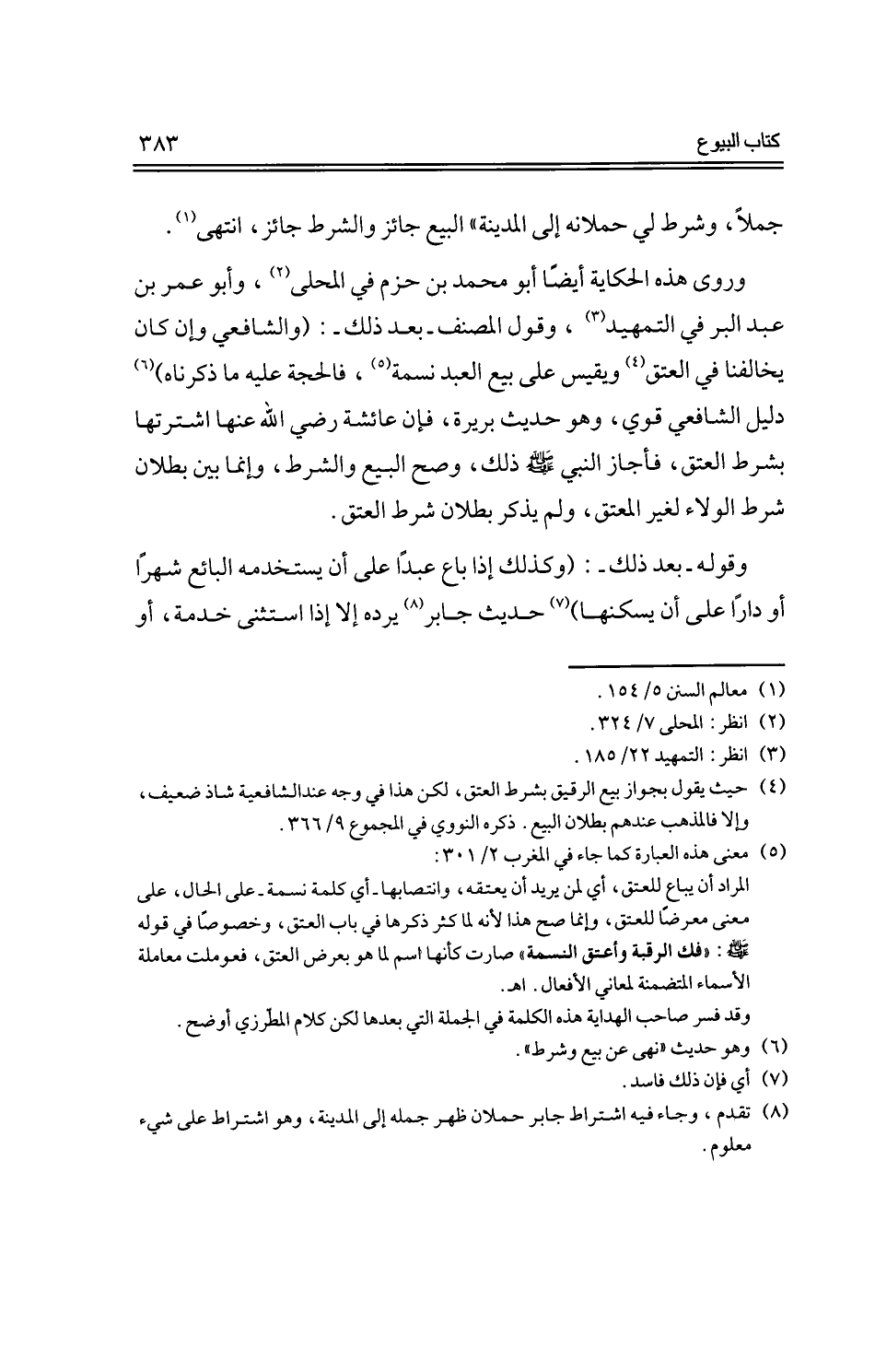 وروى هذه الحكاية أيضاً أبو محمد بن حزم في المحلي، وأبو عمر بن عبد البر في التمهيد، وقول المصنف- بعد ذلك-: (والشافعي وإن كان يخالفنا في العتق ويقيس على بيع العبد نسمة، فالحجة عليه ما ذكرناه)