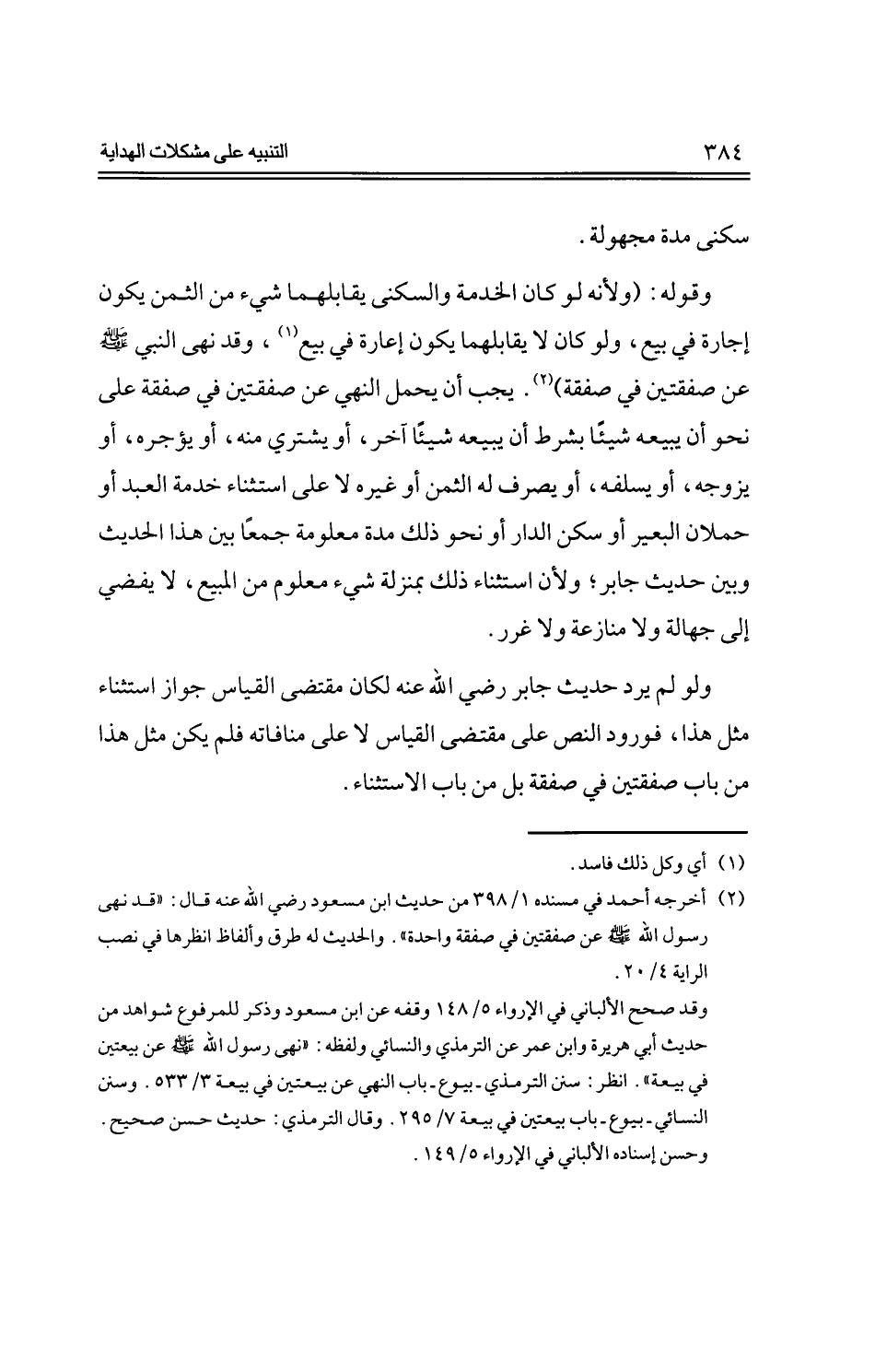 وقوله: (ولأنه لو كان الخدمة والسكنى يقابلهما شئ من الثمن يكون إجارة في بيع، ولو كان لا يقابلهما يكون إعارة في بيع، وقد نهى النبي -صلى الله عليه وسلم- عن صفقتين في صفقة). يجب أن يحمل النهي عن صفقتين في صفقة على نحو أن يبيعه شيئاً بشرط أن يبيعه شيئاً آخر، أو يشتري منه، أو يؤجره، أو يزوجه، أو يسلفه، أو يصرف له الثمن أو غيره لا على استثناء خدمة العبد أو حملان البعير أو سكن الدار أو نحو ذلك مدة معلومة جمعاً بين هذا الحديث وبين حديث جابر؛ ولأن استثناء ذلك بمنزلة شئ معلوم من المبيع، لا يفضي إلى جهالة ولا منازعة ولا غرر.