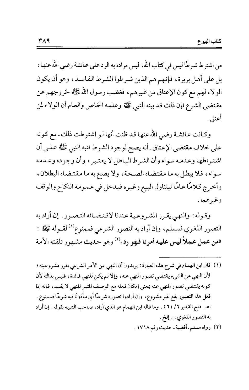 من اشترط شرطاً ليس في كتاب الله، ليس مراده به الرد على عائشة رضي الله عنها، بل على أهل بريرة، فإنهم هم الذين شرطوا الشرطة الفاسد، وهو أن يكون الولاء لهم مع كون الإعتاق من غيرهم، فغضب رسول الله -صلى الله عليه وسلم- لخروجهم عن مقتضى الشرع فإن ذلك قد بينه النبي -صلى الله عليه وسلم- وعلمه الخاص والعام أن الولاء لمن أعتق.