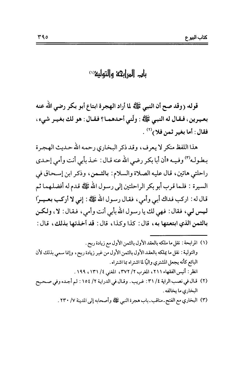 قوله: (وقد صح أن النبي -صلى الله عليه وسلم-لما أراد الهجرة ابتاع أبو بكر رضي الله عنه بعيرين، فقال له النبي -صلى الله عليه وسلم-: ولّني أحدهما؟ فقال: هو لك بغير شيء، فقال: أما بغير ثمن فلا).
