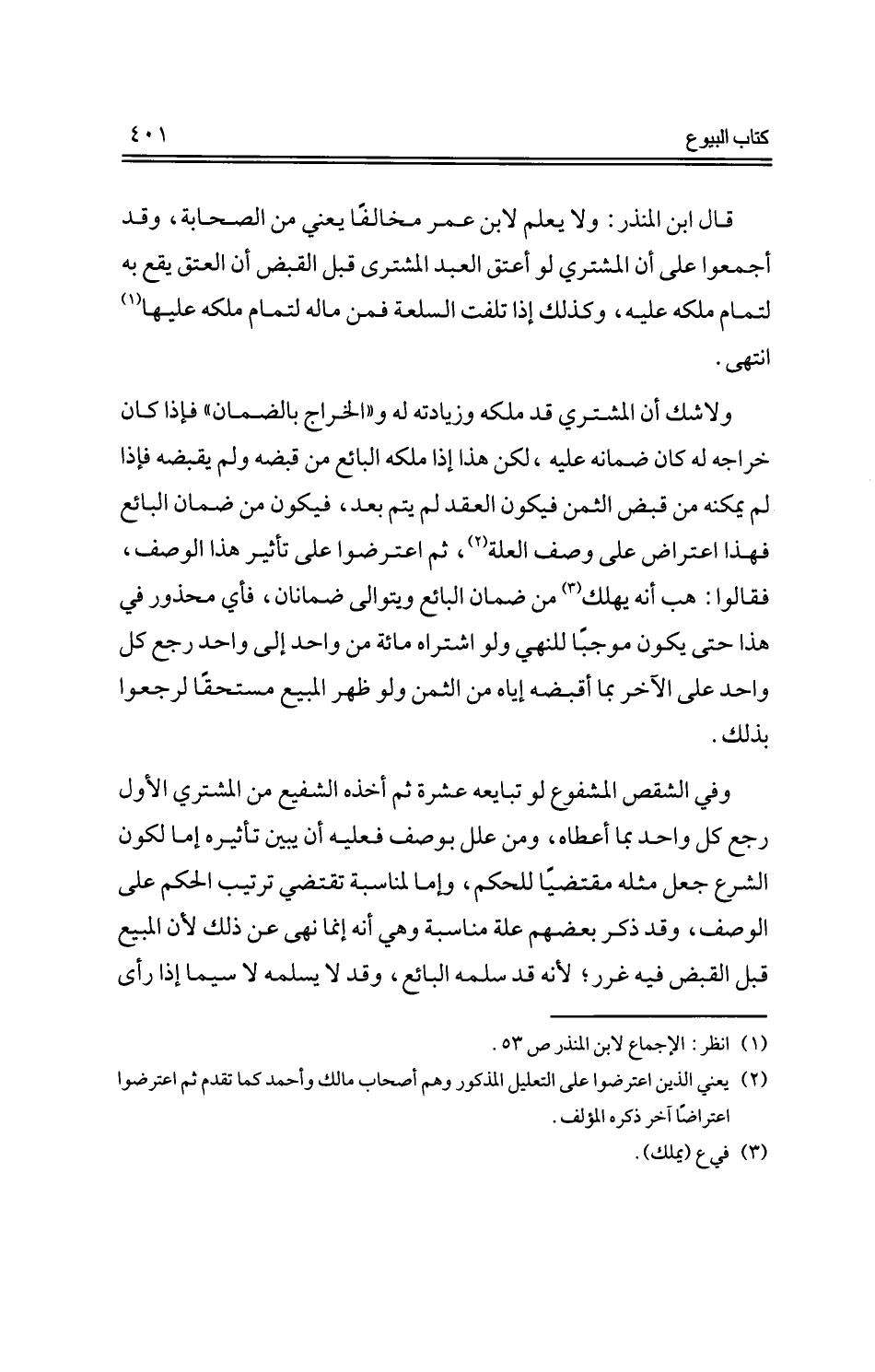 ولا شك أن المشتري قد ملكه وزيادته له و "الخراج بالضمان" فإذا كان خراجه له كان ضمانه عليه، لكن هذا إذا ملكه البائع من قبضه ولم يقبضه فإذا لم يمكنه من قبض الثمن فيكون العقد لم يتم بعد، فيكون من ضمان البائع فهذا اعتراض على وصف العلة، ثم اعترضوا على تأثير هذا الوصف، فقالوا: هب أنه يهلك من ضمان البائع ويتوالى ضمانان، فأي محذور في هذا يكون موجباً للنهي ولو اشتراه مائة من واحد إلى واحد رجع إلى واحد على الآخر بما أقبضه إياه من الثمن ولو ظهر المبيع مستحقاً لرجعوا بذلك.