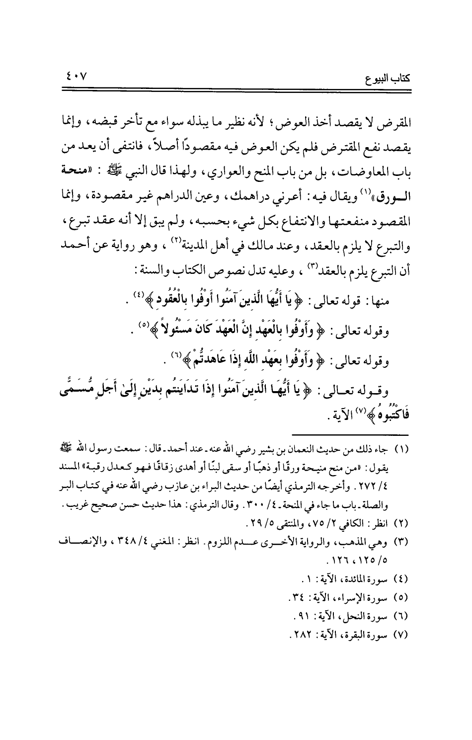 المقرض لا يقصد أخذ العوض؛ لأنه نظير ما يبذله سواء مع تأخر قبضه، وإنما يقصد نفع المقترض فلم يكن العوض فيه مقصوداً أصلاً، فانتفى أن يعد من باب المعاوضات، بل من باب المنح والعواري، ولهذا قال النبي -صلى الله عليه وسلم-: "منحة الورق" ويقال فيه: أعرني دراهمك، وعين الدراهم غير مقصودة، وإنما المقصودة منفعتها والانتفاع بكل شئ بحسبه، ولم يبق إلا أنه عقد تبرع، والتبرع لا يلزم بالعقد، وعند مالك في أهل المدينة، وهو رواية عن أحمد أن التبرع يلزم بالعقد، وعليه تدل نصوص الكتاب والسنة: