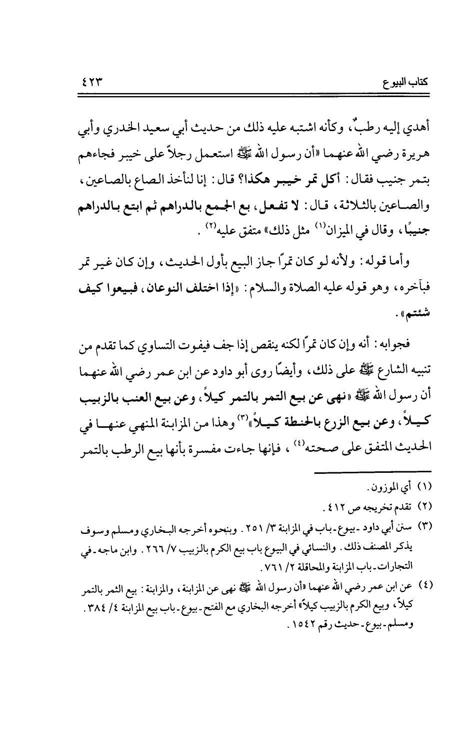 فجوابه: أنه وإن كان تمراً لكنه ينقص إذا جف فيفوت التساوي كما تقدم من تنبيه الشارع -صلى الله عليه وسلم- على ذلك، وأيضاً روى أبو داود عن ابن عمر رضي الله عنهما أن رسول الله -صلى الله عليه وسلم- "نهى عن بيع التمر بالتمر كيلا، وعن بيع العنب بالزبيب كيلاً، وعن بيع الزرع بالحنطة كيلاً" وهذا من المزابنة المنهي عنها في الحديث المتفق على صحته، فإنها جاءت مفسرة بأنها بيع الرطب بالتمر