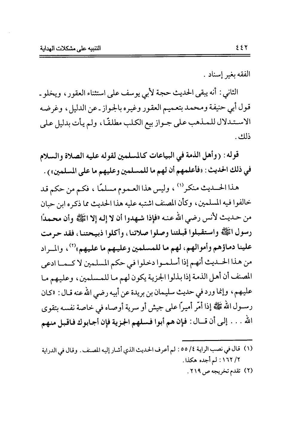 هذا الحديث منكر، وليس هذا العموم مسلماً، فكم من حكم قد خالفوا فيه المسلمين، وكأن المصنف اشتبه عليه هذا الحديث مما ذكره ابن حبان من حديث لأنس رضي الله عنه "فإذا شهدوا أن لا إله إلا الله -صلى الله عليه وسلم- وأن محمداً رسول الله -صلى الله عليه وسلم- واستقبلوا قبلتنا وصلوا صلاتنا، وأكلوا ذبيحتنا، فقد حرمت علينا دماؤهم وأموالهم، لهم ما للمسلمين وعليهم ما عليهم"، والمراد من هذا الحديث أنهم إذا أسلموا دخلوا في حكم المسلمين لا كما ادعى المصنف أن أهل الذمة إذا بذلوا الجزية يكون لهم ما للمسلمين، وعليهم ما عليهم، وإنما ورد في حديث سليمان بن بريدة عن أبيه رضي الله عنه قال: "كان رسول الله -صلى الله عليه وسلم- إذا أمر أميراً على جيش أو سرية أوصاه في خاصة نفسه بتقوى الله ... إلى أن قال: فإن هم أبوا فسلهم الجزية فإن أجابوك فاقبل منهم