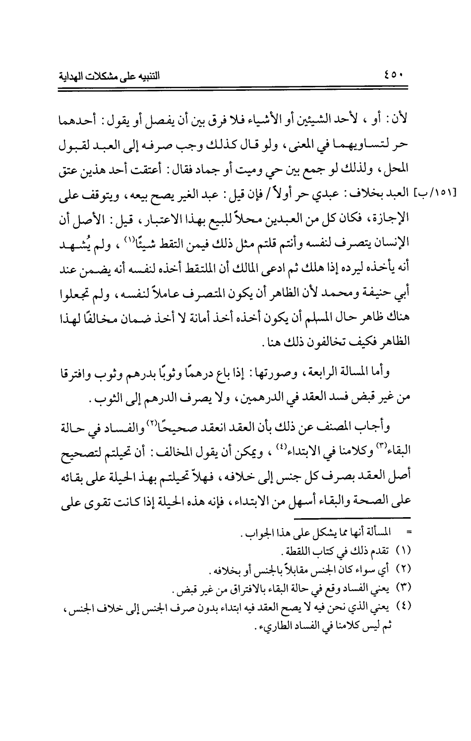 وأجاب المصنف عن ذلك بأن العقد انعقد صحيحاً والفساد في حالة البقاء وكلامنا في الابتداء، ويمكن أن يقول المخالف: إن تحيلتم لتصحيح أصل العقد بصرف كل جنس إلى خلافه، فهلا تحيلتم بهذه الحيلة على بقائه على الصحة والبقاء أسهل من الابتداء، فإنه هذه الحيلة إذا كانت تقوى على