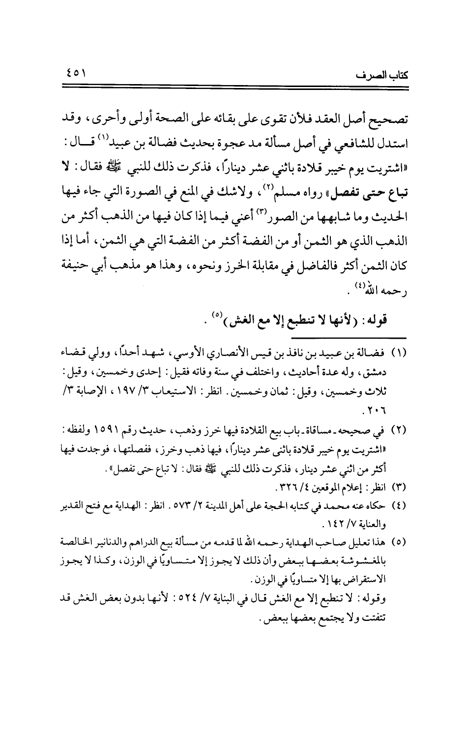 تصحيح أصل العقد فلأن تقوى على بقائه على الصحة أولى وأحرى، وقد استدل للشافعي في أصل مسألة مد عجوة بحديث فضالة بن عبيد قال: "اشتريت يوم خيبر قلادة باثني عشر ديناراً، فذكرت ذلك للنبي -صلى الله عليه وسلم- فقال: لا تباع حتى تفصل" رواه مسلم، ولا شك في المنع في الصورة التي جاء فيها الحديث وما شابهها من الصور أعني فيما إذا كان فيها من الذهب أكثر من الذهب الذي هو الثمن أو من الفضة أكثر من الفضة التي هي الثمن، أما إذا كان الثمن أكثر فالفاضل في مقابلة الخرز ونحوه، وهذا هو مذهب أبي حنيفة رحمه الله.
