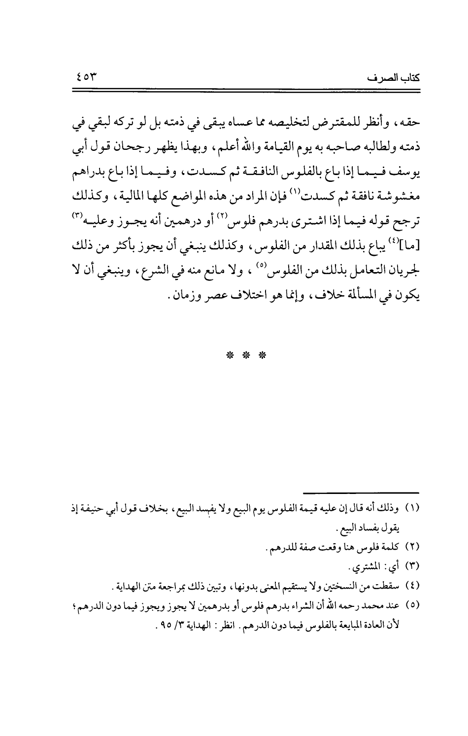 حقه، وأنظر للمقترض لتخليصه مما عساه يبقى في ذمته بل لو تركه لبقي في ذمته ولطالبه صاحبه يوم القيامة والله أعلم، وبهذا يظهر رجحان قول أبي يوسف فيما إذا باع بالفلوس النافقة ثم كسدت، وفيما إذا باع بدراهم مغشوشة نافقة ثم كسدت فإن المراد من هذه المواضع كلها المالية، وكذلك ترجح قوله فيما إذا اشترى بدرهم فلوس أو درهمين أنه يجوز وعليه [ما] يباع بذلك المقدار من الفلوس، وكذلك ينبغي أن يجوز بأكثر من ذلك لجريان التعامل بذلك من الفلوس، ولا مانع منه في الشرع، وينبغي أن لا يكون في المسألة خلاف، وإنما هو اختلاف عصر وزمان.