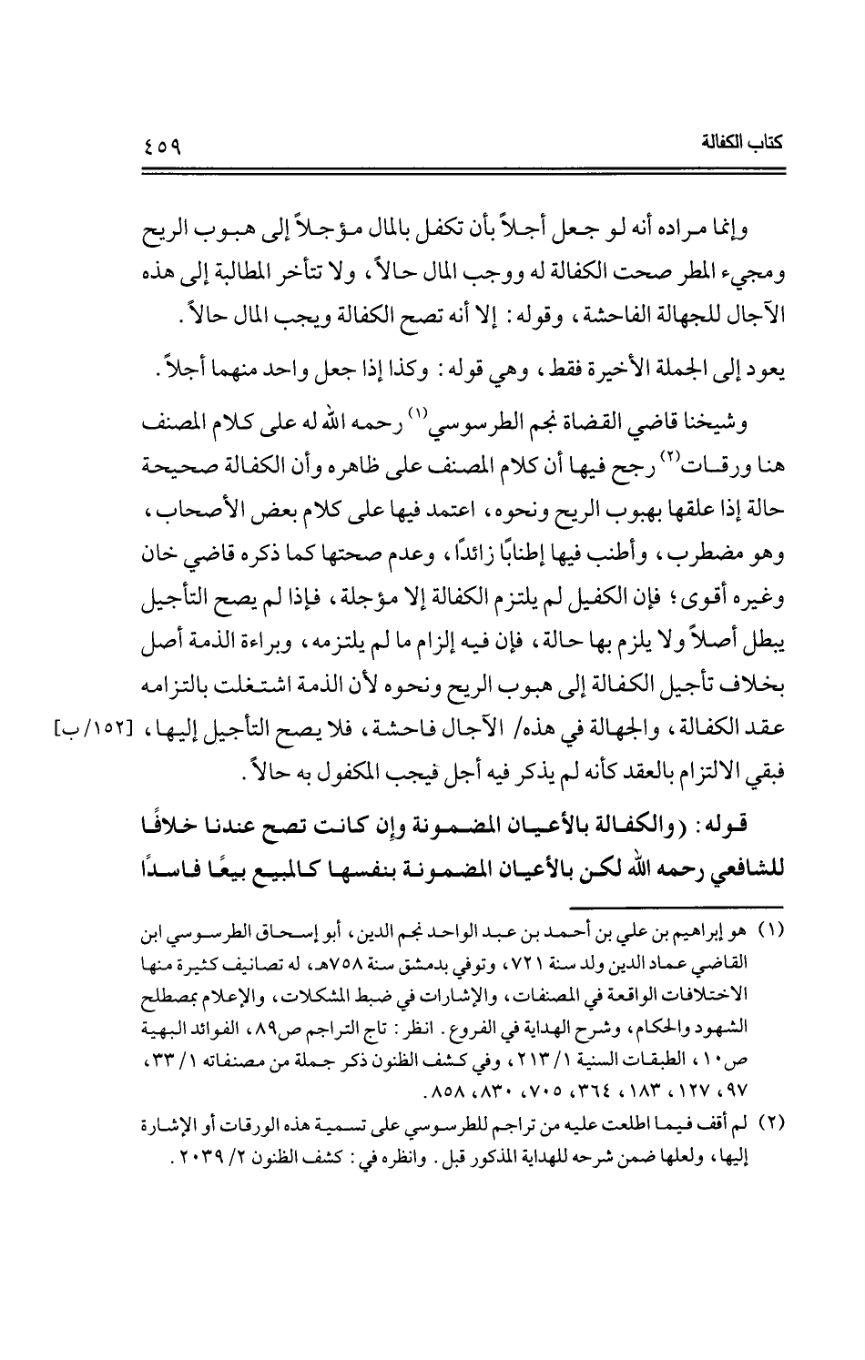 وشيخنا قاضي القضاة نجم الطرسوسي، رحمه الله له على كلام المصنف هنا ورقات رجح فيها أن كلام المصنف على ظاهره وأن الكفالة الصحيحة حالة إذا علقها بهبوب الريح ونحوه، اعتمد فيها على كلام بعض الأصحاب، وهو مضطرب، وأطنب فيها إطناباً زائداً، وعدم صحتها كما ذكرناه قاضي خان وغيره أقوى؛ فإن الكفيل لم يلتزم الكفالة إلا مؤجلة، فإذا لم يصح التأجيل يبطل أصلاً ولا يلزم بها حالة، فإن فيه إلزام ما لم يلزمه، وبراءة الذمة أصل بخلاف تأجيل الكفالة إلى هبوب الريح ونحوه لأن الذمة اشتغلت بالتزامه عقد الكفالة، والجهالة في هذه/ الآجال فاحشة، فلا يصح التأجيل إليها، فبقي الالتزام بالعقد كأنه لم يذكر فيه أجل فيجب المكفول به حالاً.