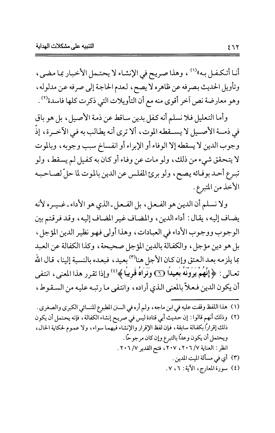 أنا أتكفل به"، وهذا صريح في الإنشاء لا يحتمل الأخبار بما مضى، وتأويل الحديث بصرفه عن ظاهره لا يصح، لعدم الحاجة إلى صرفه عن مدلوله، وهو معارضة نص آخر أقوى منه مع أن التأويلات التي ذكرت كلها فاسدة.