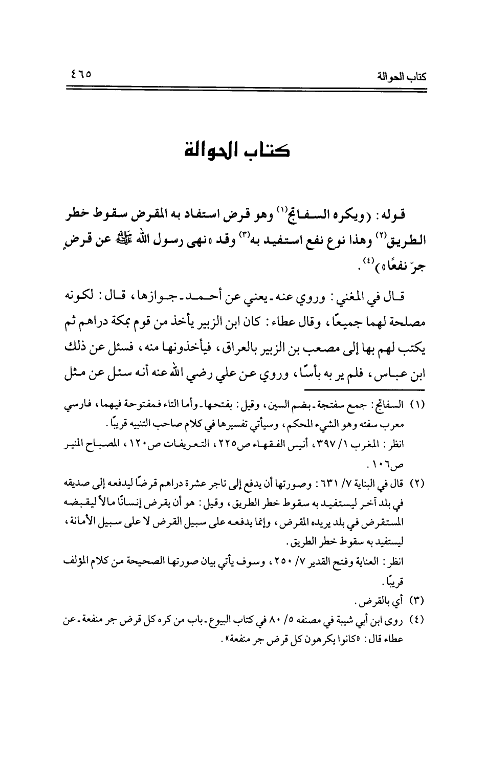 قوله: (ويكره السفاتج وهو قرض استفاد به المقرض سقوط خطر الطريق وهذا نوع نفع استفيد به وقد "نهي رسول الله -صلى الله عليه وسلم- عن قرضٍ جر نفعاً).