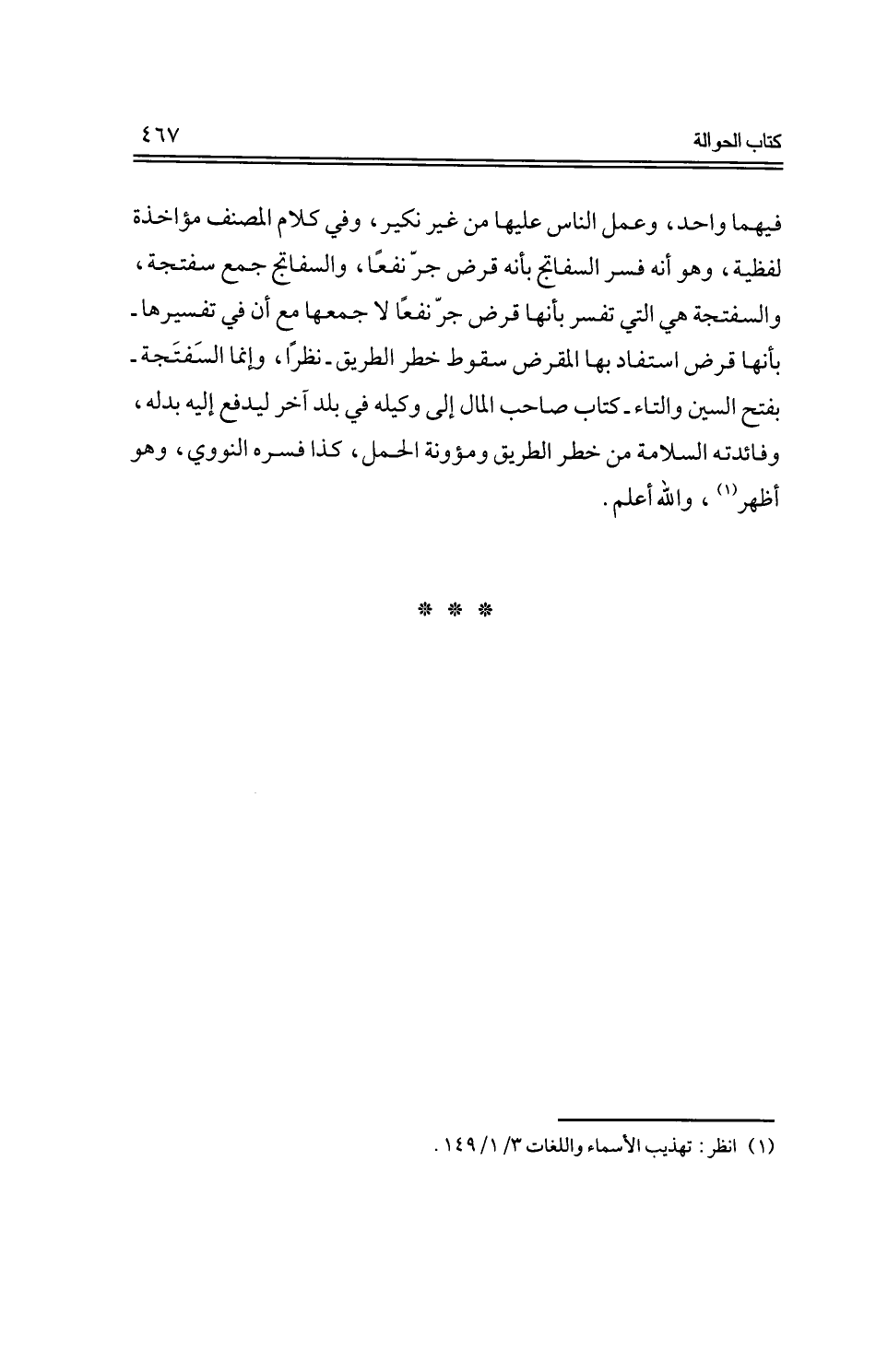 فيهما واحد، وعمل الناس عليها من غير نكير، وفي كلام المصنف مؤاخذة لفظية، وهو أنه فسر السفاتج بأنه قرض جر نافعاً، والسفاتج جمع سفتجة، والسفتجة هي التي تفسر بأنها قرض جر نفعاً لا جمعها مع أن في تفسيرها- بأنها قرض استفاد بها المقرض سقوط خطر الطريق- نظراً، وإنما السفتجة- بفتح السين والتاء- كتاب صاحب المال إلى وكيله في بلد آخر ليدفع إليه بدله، وفائدته السلامة من خطر الطريق ومؤونة الحمل، كذا فسره النووي، وهو أظهر، والله أعلم.