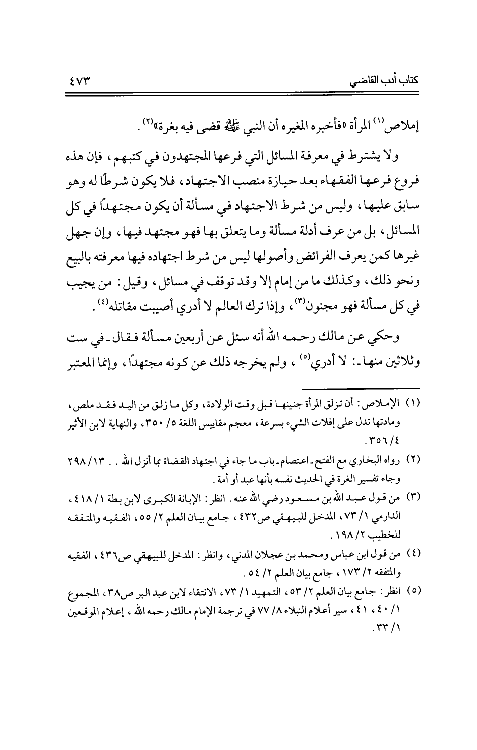 ولا يشرط في معرفة المسائل التي فرعها المجتهدون في كتبهم، فإن هذه فروع فرعها الفقهاء بعد حيازة منصب الاجتهاد، فلا يكون شرطاً له وهو سابق عليها، وليس من شرط الاجتهاد في مسألة أن يكون مجتهداً في كل المسائل، بل من عرف أدلة مسألة وما يتعلق بها فهو مجتهد فيها، وإن جهل غيرها كمن يعرف الفرائض وأصولها ليس من شرط اجتهاده فيها معرفته بالبيع ونحو ذلك، وكذلك ما من إمام إلا وقد توقف في مسائل، وقيل: من يجيب في كل مسألة فهو مجنون، وإذا ترك العالم لا أدري أصيبت مقاتله.