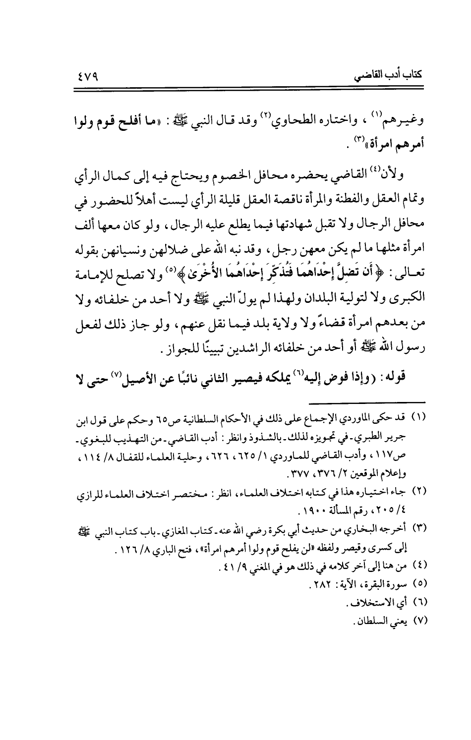 ولأن القاضي يحضره محافل الخصوم ويحتاج فيه إلى كمال الرأي وتمام العقل والفطنة والمرأة ناقصة العقل قليلة الرأي ليست أهلاً للحضور في محافل الرجال ولا تقبل شهادتها فيما يطلع عليه الرجال، ولو كان معها ألاف امرأة مثلها ما لم يكن معهن رجل، وقد نبه الله على ضلالهن ونسيانهن بقوله تعالى: {أن تضل إحداهما فتذكر إحداهما الأخرى} ولا تصلح للإمامة الكبرى ولا لتولية البلدان ولهذا لم يول النبي -صلى الله عليه وسلم- ولا أحد من خلفائه ولا من بعدهم امرأة قضاء ولا ولاية بلد فيما نقل عنهم، ولو جاز ذلك لفعل رسول الله -صلى الله عليه وسلم- أو أحد من خلفائه الراشدين تبييناً للجواز.